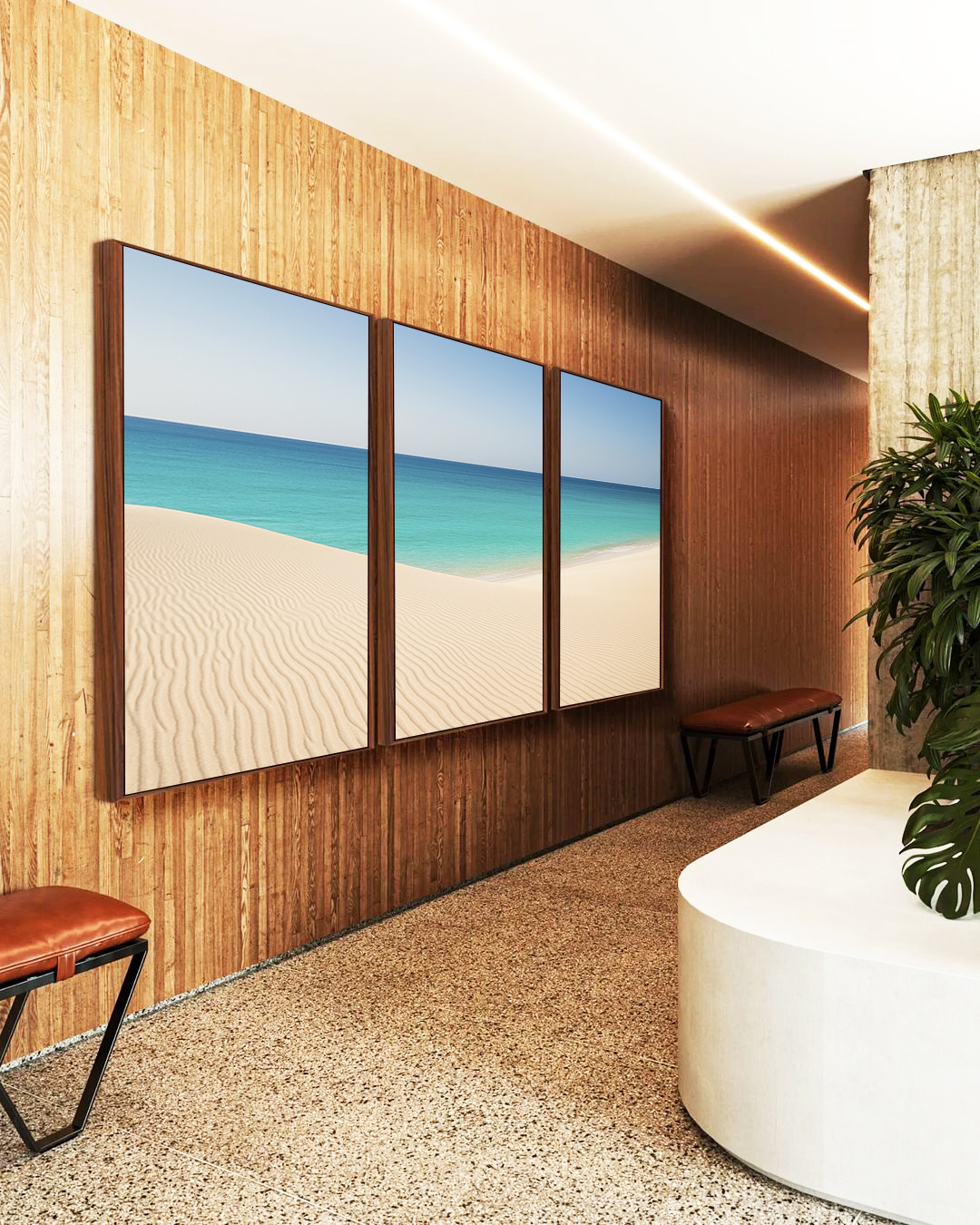 Calmo e sofisticado, este Trio de Quadros com praia clara, céu limpo e mar azul cria uma atmosfera leve e relaxante. A escolha certa para salas modernas, quartos tranquilos, escritórios profissionais ou halls de entrada bem decorados.
