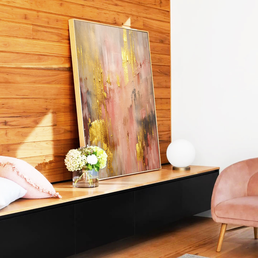 Nuances de rosa e dourado sobre base cinza, transmitindo luxo sutil e delicadeza. Combinação perfeita para quem busca um toque moderno e feminino. Excelente para salas e quartos com estilo contemporâneo e sofisticado.v