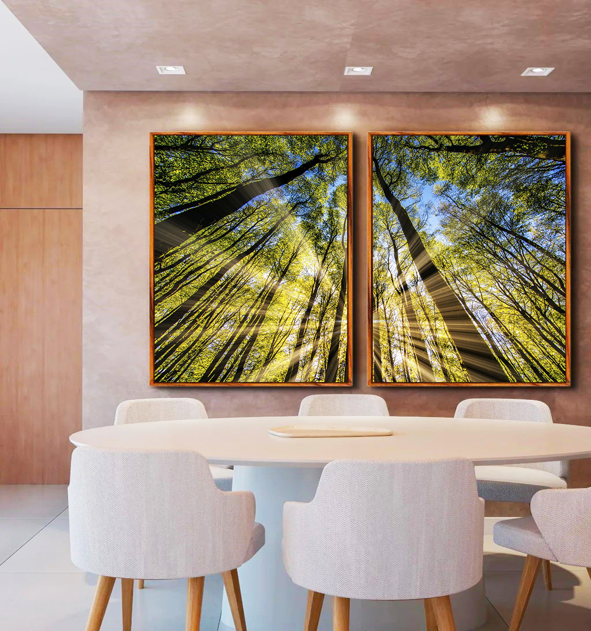 O Duo de Quadros captura a serenidade da floresta com céu azul e raios de sol. Ideal para salas, quartos ou escritórios, sua moldura extra fina flutuante proporciona sofisticação e charme natural, transformando a decoração com elegância e frescor.