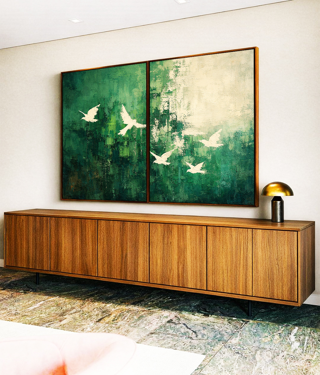 Pássaros voando sobre fundo verde com textura abstrata criam sensação de liberdade, leveza e tranquilidade. Estilo moderno e elegante que valoriza a decoração com suavidade. Perfeito para salas, quartos e escritórios.
