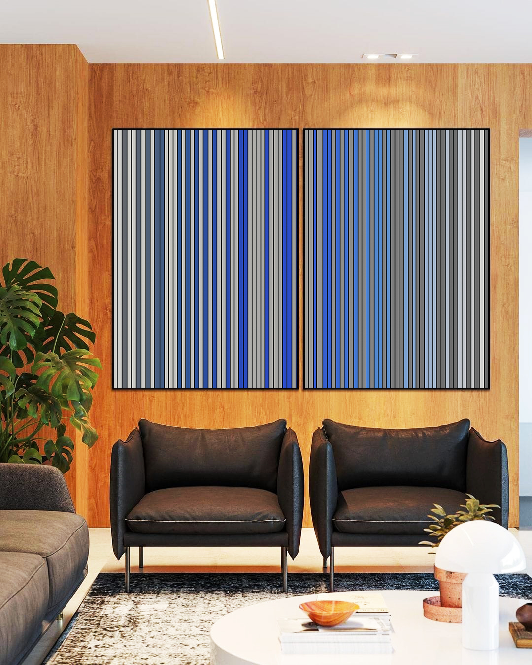 Com nuances em degradê que vão do cinza ao azul profundo, este Duo de Quadros abstrato é perfeito para quem busca modernidade e equilíbrio. A escolha certa para compor salas amplas, quartos sofisticados ou escritórios com design minimalista.