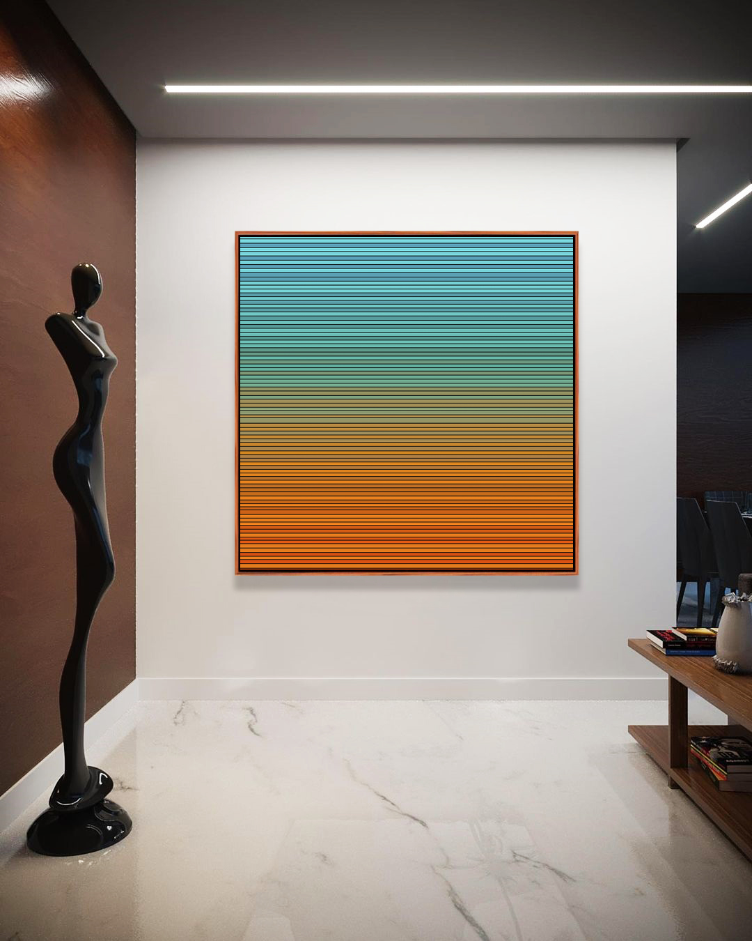 Com listras elegantes e degradê envolvente em azul turquesa e laranja, este Quadro Quadrado traz equilíbrio e modernidade. A escolha ideal para enriquecer sua sala, quarto ou escritório com um toque artístico atual e atraente.