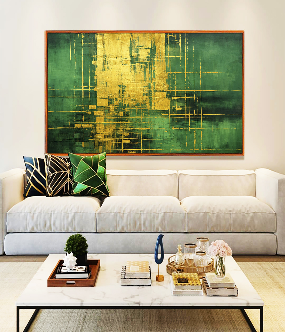 Tons intensos de verde escuro com dourado criam um visual abstrato luxuoso e contemporâneo. O efeito pintura adiciona textura e destaque, trazendo personalidade para salas, quartos e espaços que buscam um toque elegante e imponente.