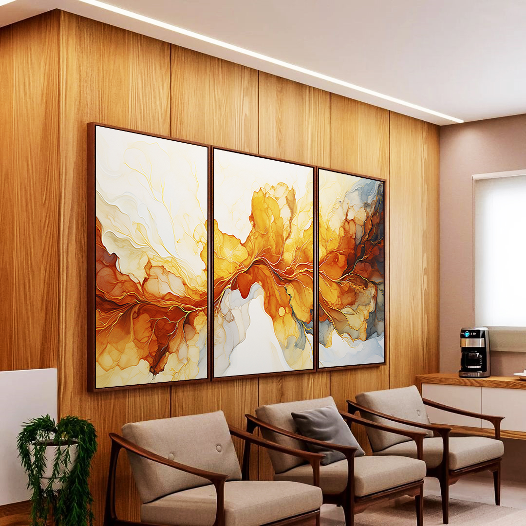 Composição em três partes com arte pouring vibrante. O Trio mescla amarelo, dourado e cinza com equilíbrio visual. Ideal para salas amplas, halls sofisticados ou escritórios elegantes. Moldura flutuante moderna que valoriza a estética da arte.