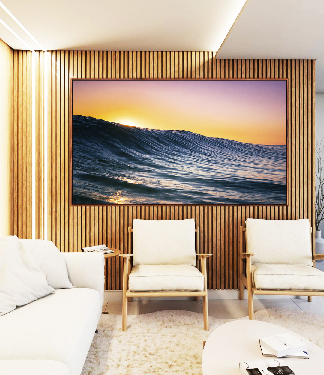 O pôr do sol sobre o mar azul ondulado cria uma atmosfera acolhedora e serena, trazendo leveza e movimento ao espaço. Ideal para salas, quartos e ambientes que buscam tranquilidade com inspiração natural.