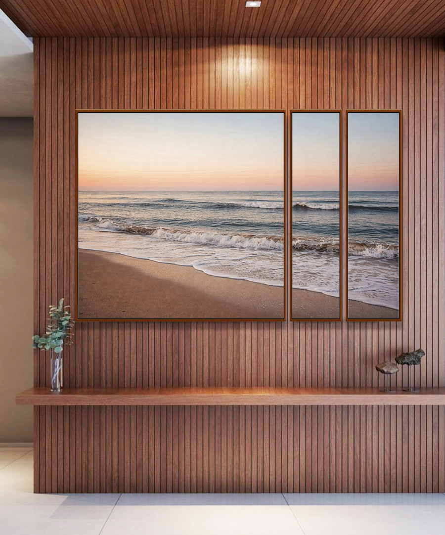 O encontro do mar calmo com o céu azul alaranjado transmite paz e equilíbrio visual. O Trio de Quadros Estilizados é ideal para decorar salas de estar, escritórios refinados ou quartos, adicionando serenidade e um toque contemporâneo à decoração.