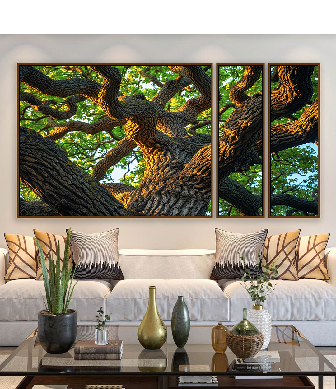 Uma composição artística sofisticada: este trio de quadros estilizados com árvore, tronco e folhas verdes em moldura flutuante transmite equilíbrio e beleza natural. Perfeito para transformar salas, halls de entrada ou escritórios modernos.