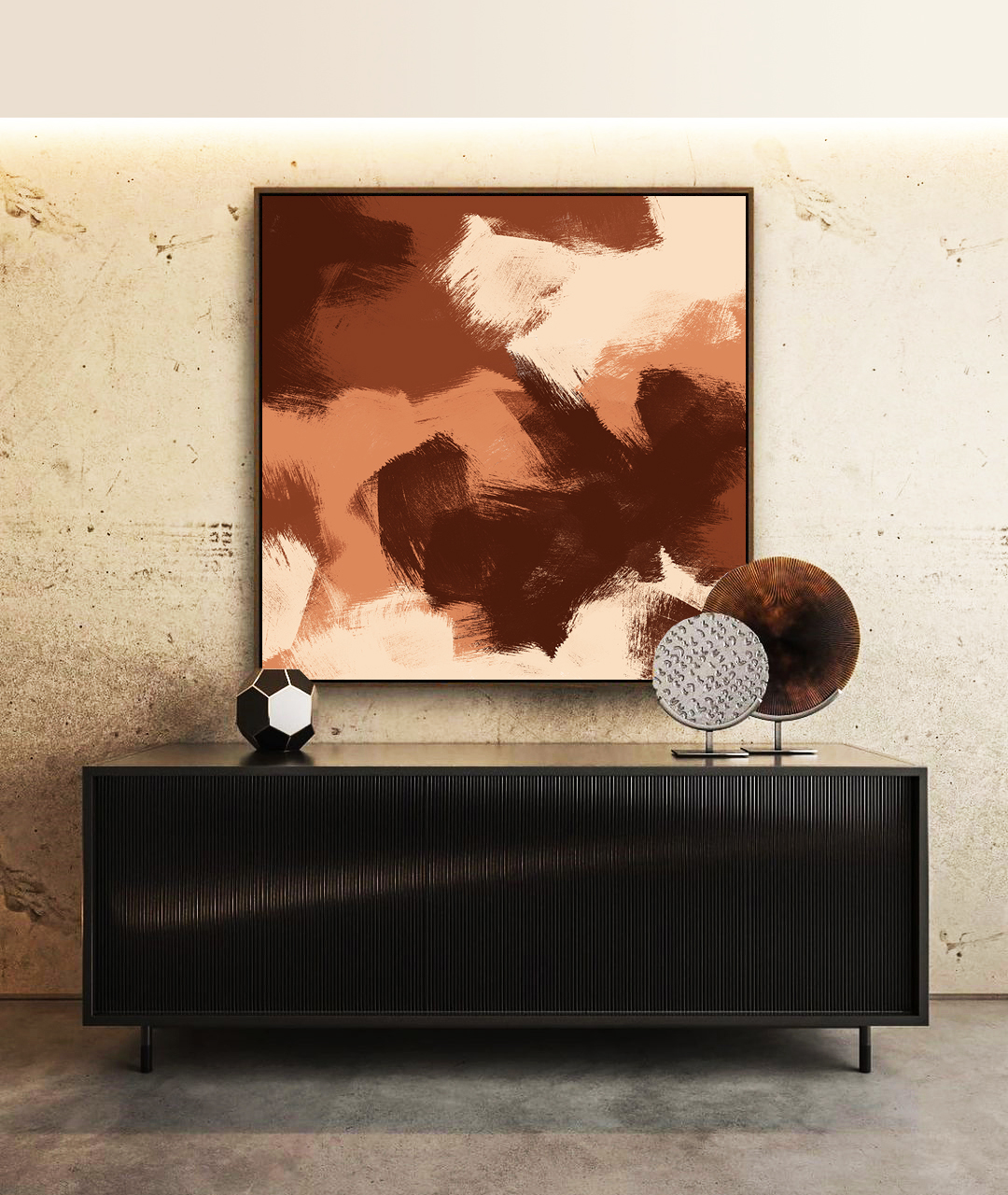 Com efeito de pintura em tons marrom e pêssego, este Quadro Quadrado adiciona calor, estilo e elegância discreta ao ambiente.