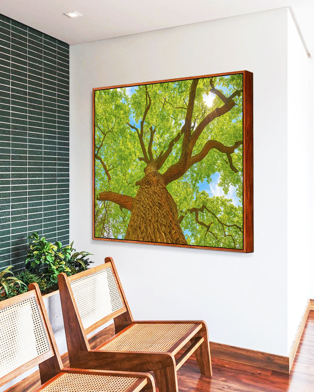 Com árvore em destaque e luz natural filtrada pelas folhas verdes, este Quadro Quadrado transmite harmonia e bem-estar. Ideal para salas amplas, escritórios ou halls de entrada, transformando o ambiente com sofisticação natural.