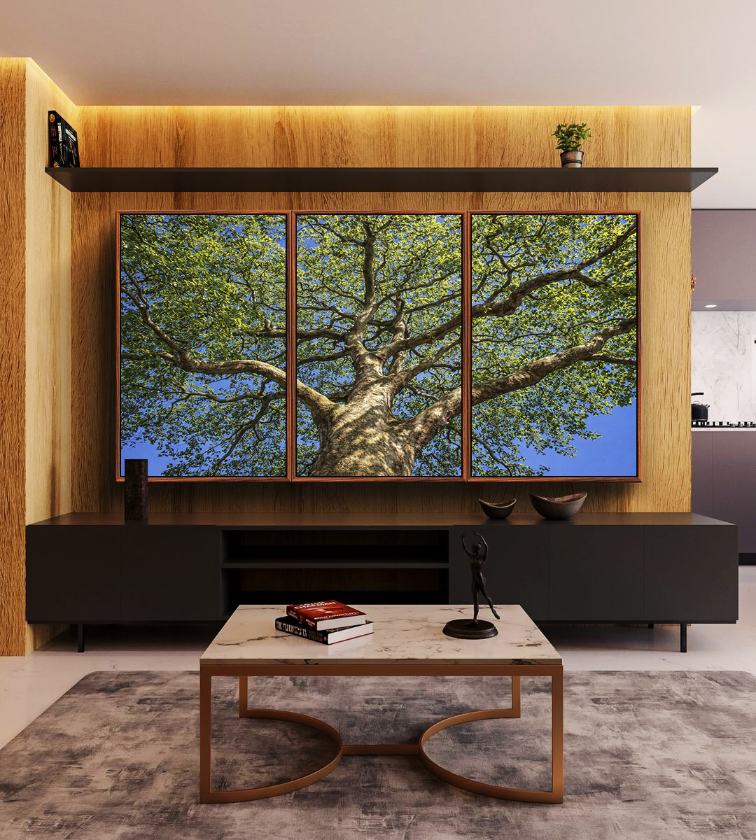 Copa de árvore com folhagem verde sob céu azul cria atmosfera leve e natural. Elemento de natureza que traz frescor, equilíbrio e conexão com o exterior. Decoração inspirada em paisagem natural, muito procurada para salas, escritórios e recepções.