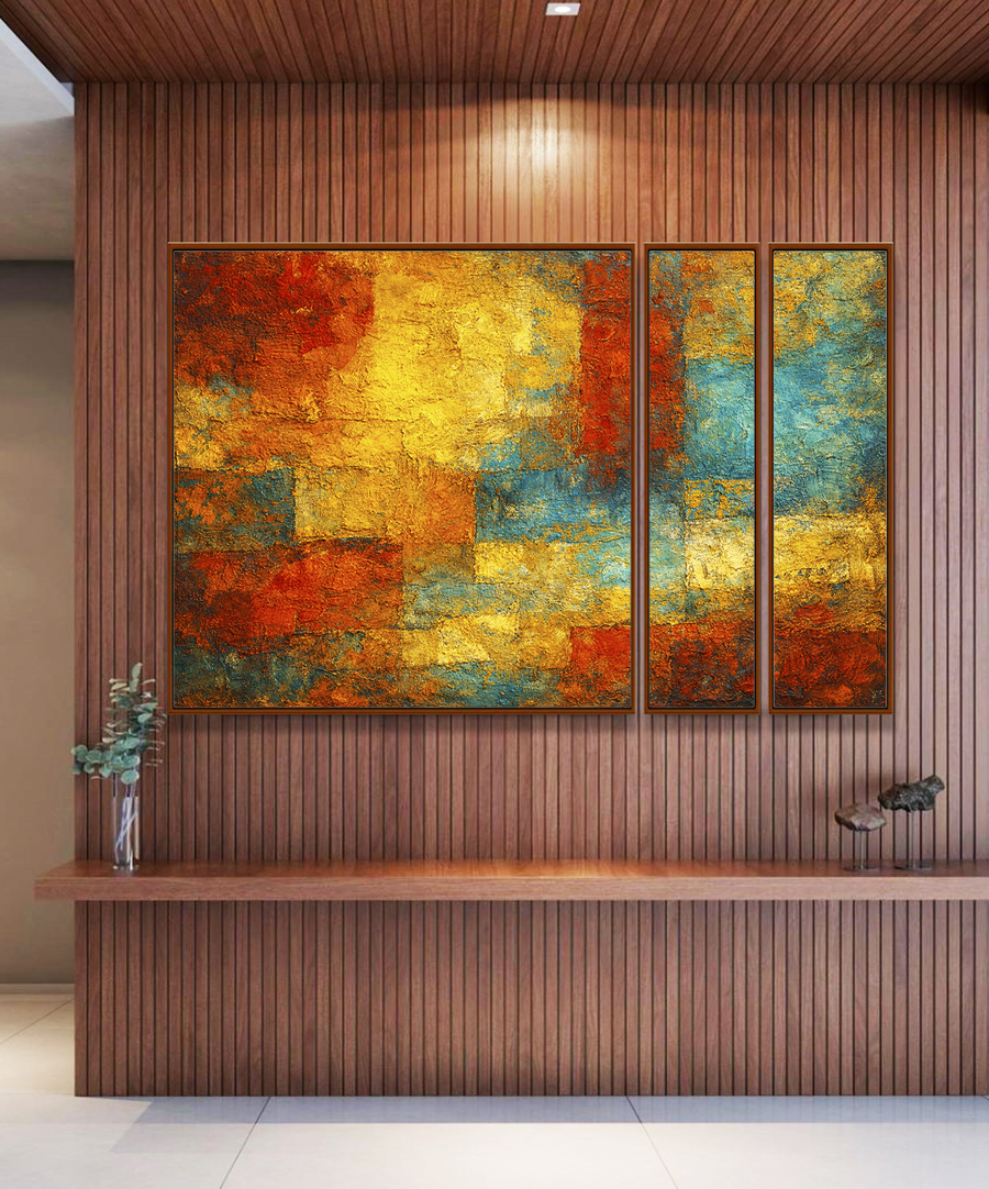 Trio de Quadros Estilizados Abstrato Textura Amarelo Laranja Turquesa Canvas Moldura