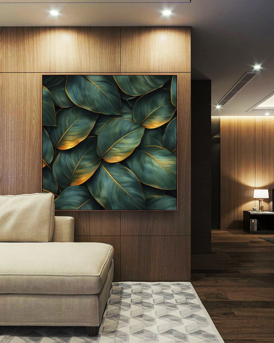 Folhas tropicais em verde profundo com detalhes dourados que trazem sofisticação e frescor ao ambiente. Ideal para sala, quarto ou escritório, criando um toque natural e elegante.