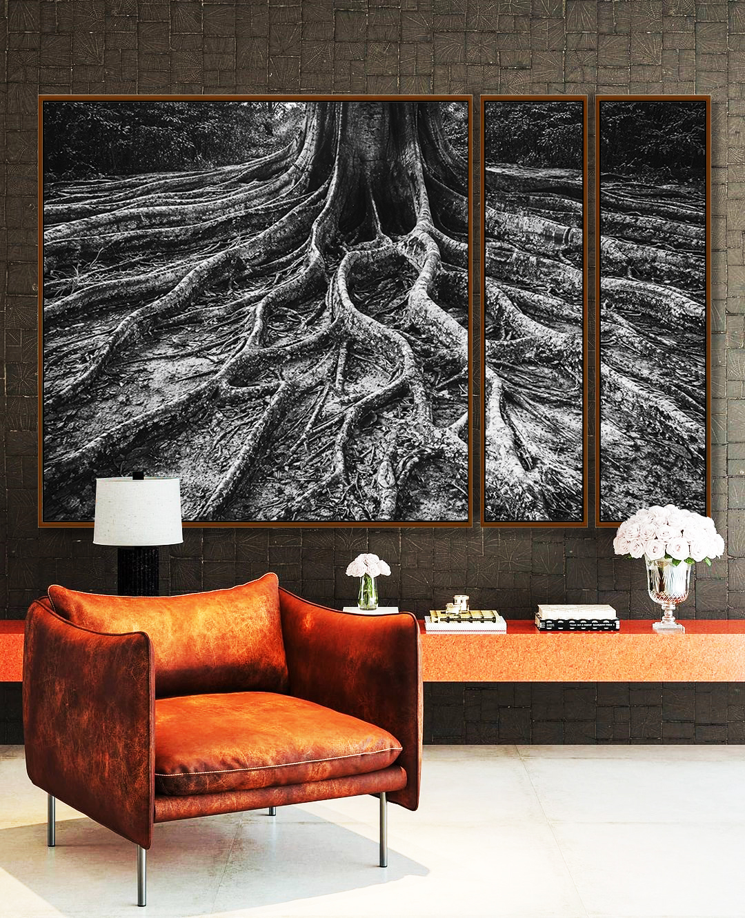 Raízes profundas de árvore em preto e branco criam impacto visual, destacando linhas orgânicas, natureza e textura natural. Estilo elegante e contemporâneo que harmoniza com decorações modernas. Ótima escolha para salas, escritórios e recepções.
