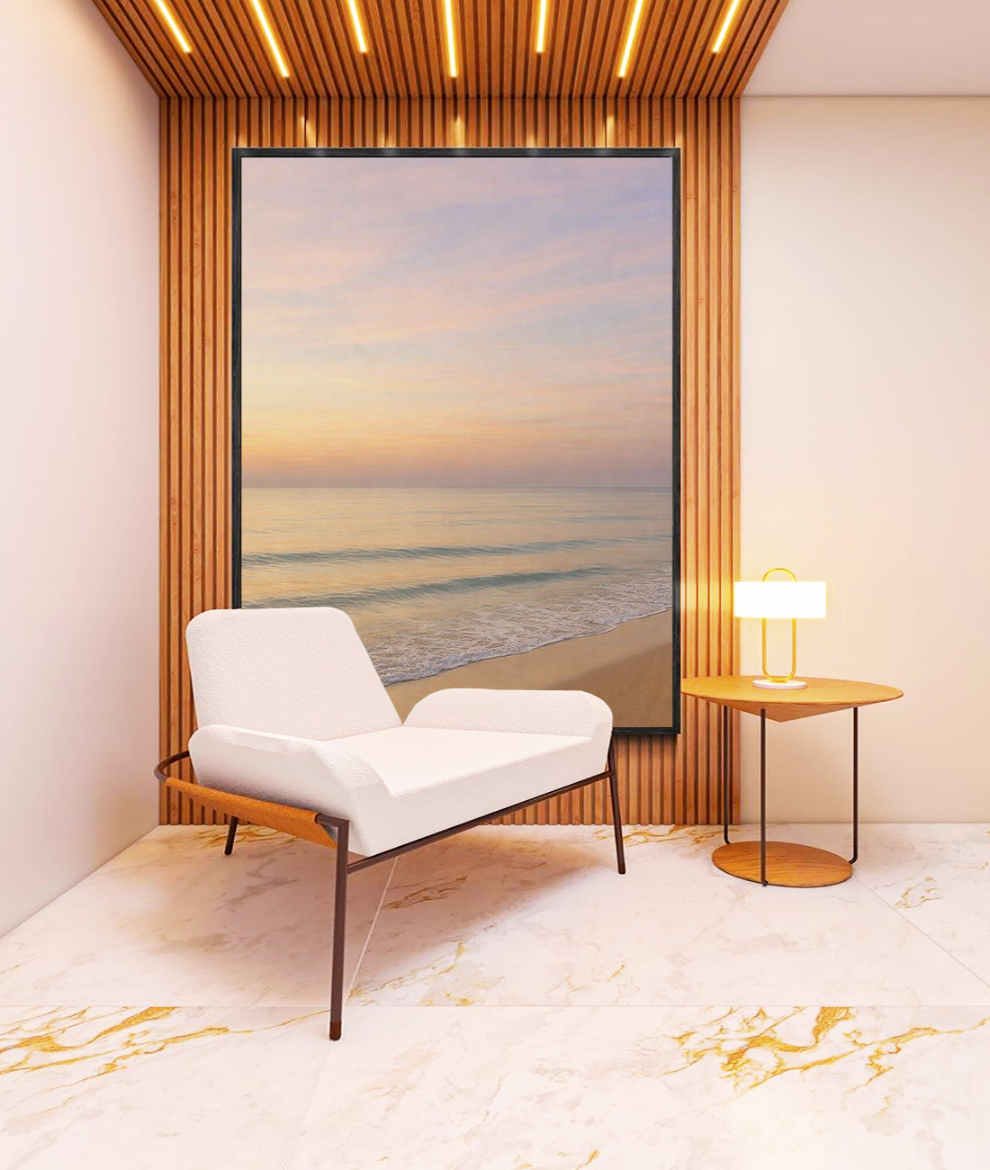 Sereno e encantador, este Quadro Vertical com nascer do sol lilás sobre praia serena e mar azul prateado cria atmosfera leve e sofisticada. A escolha ideal para salas elegantes, quartos tranquilos, ou escritórios modernos.