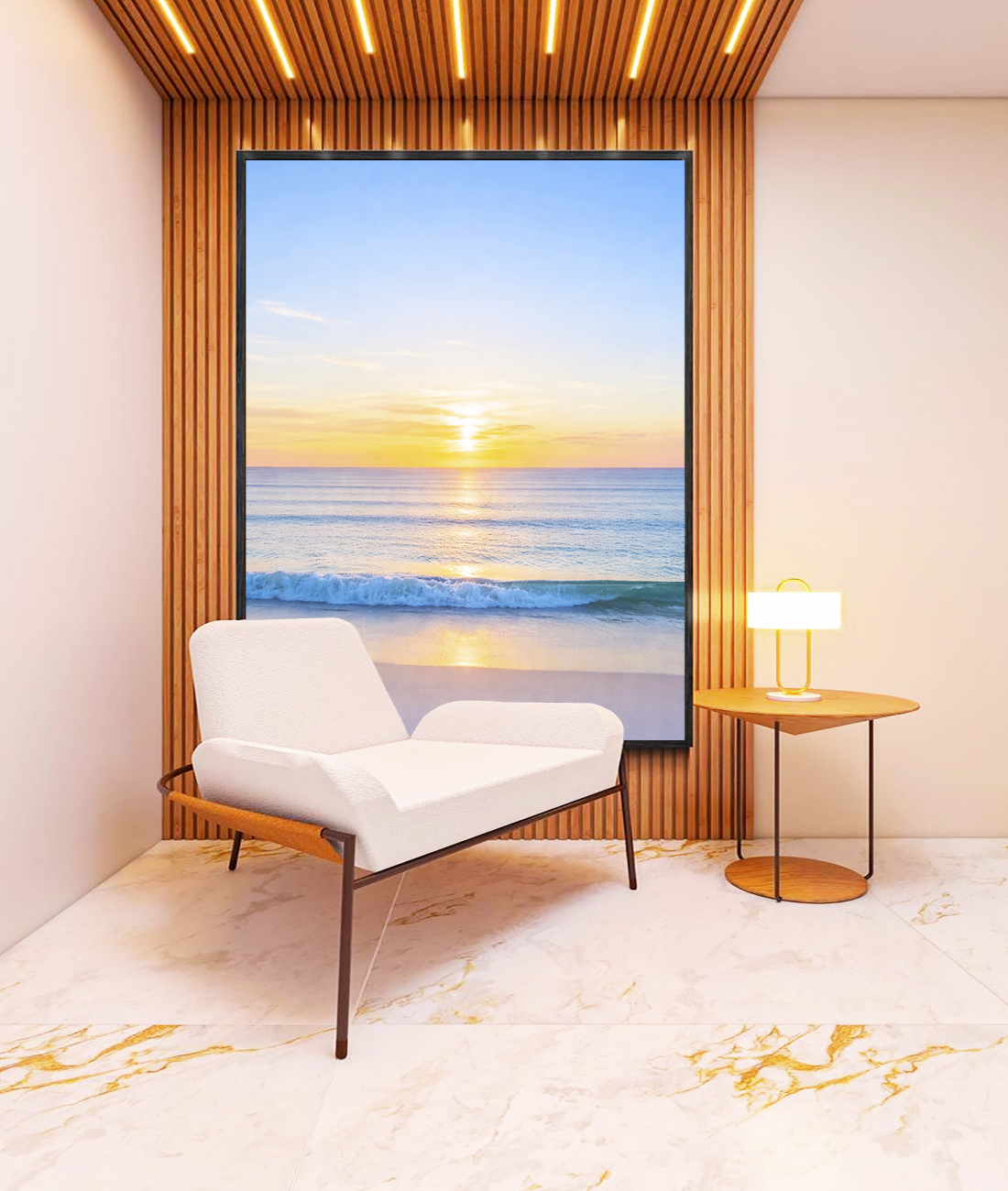 Leve e inspirador, este Quadro Vertical retrata a natureza litorânea com mar azul claro e céu aberto ao nascer do sol, arte cheia de harmonia. A escolha ideal para quartos tranquilos, escritórios sofisticados ou salas elegantes.
