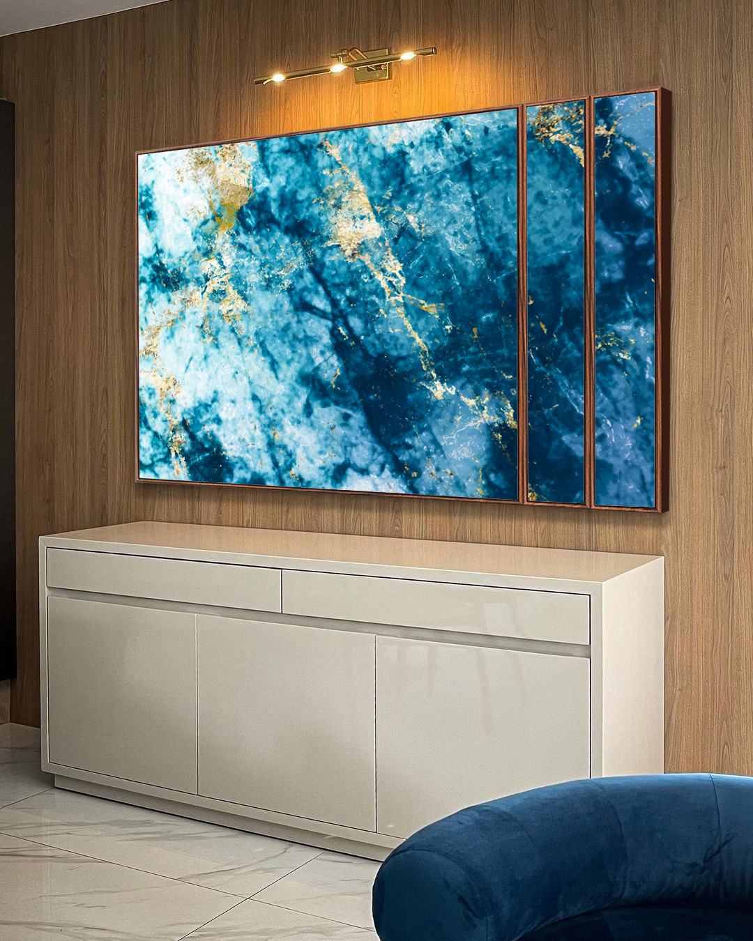 Arte e requinte para seu lar com este Trio de Quadros Estilizados abstratos azul e dourado. O efeito mármore e a impressão em canvas garantem um toque moderno e sofisticado à sua decoração.