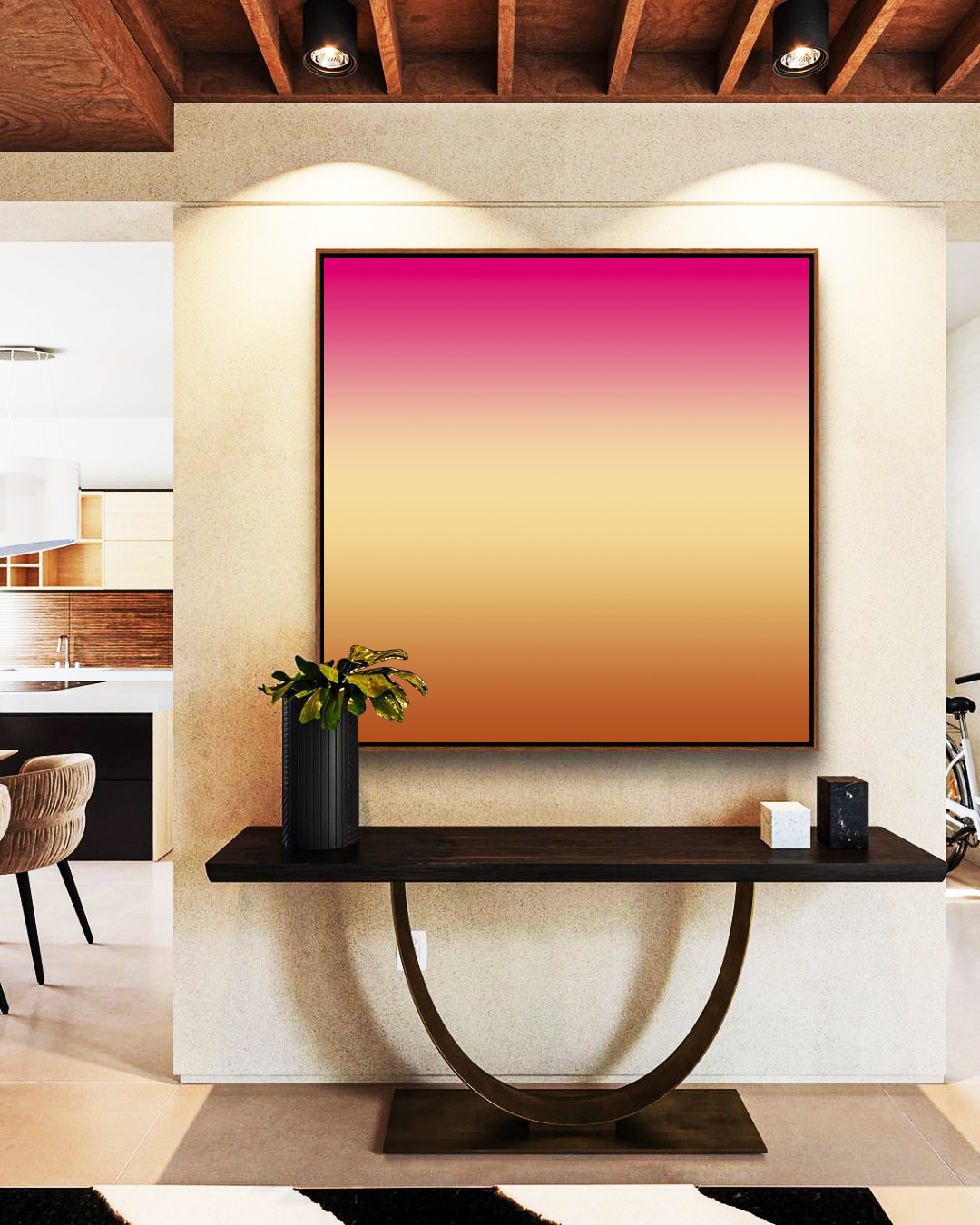 Este Quadro Quadrado traz um degradê sofisticado em rosa choque, bege e caramelo. Sua moldura flutuante valoriza o design, sendo perfeito para embelezar salas de estar, escritórios elegantes ou quartos, adicionando charme contemporâneo.