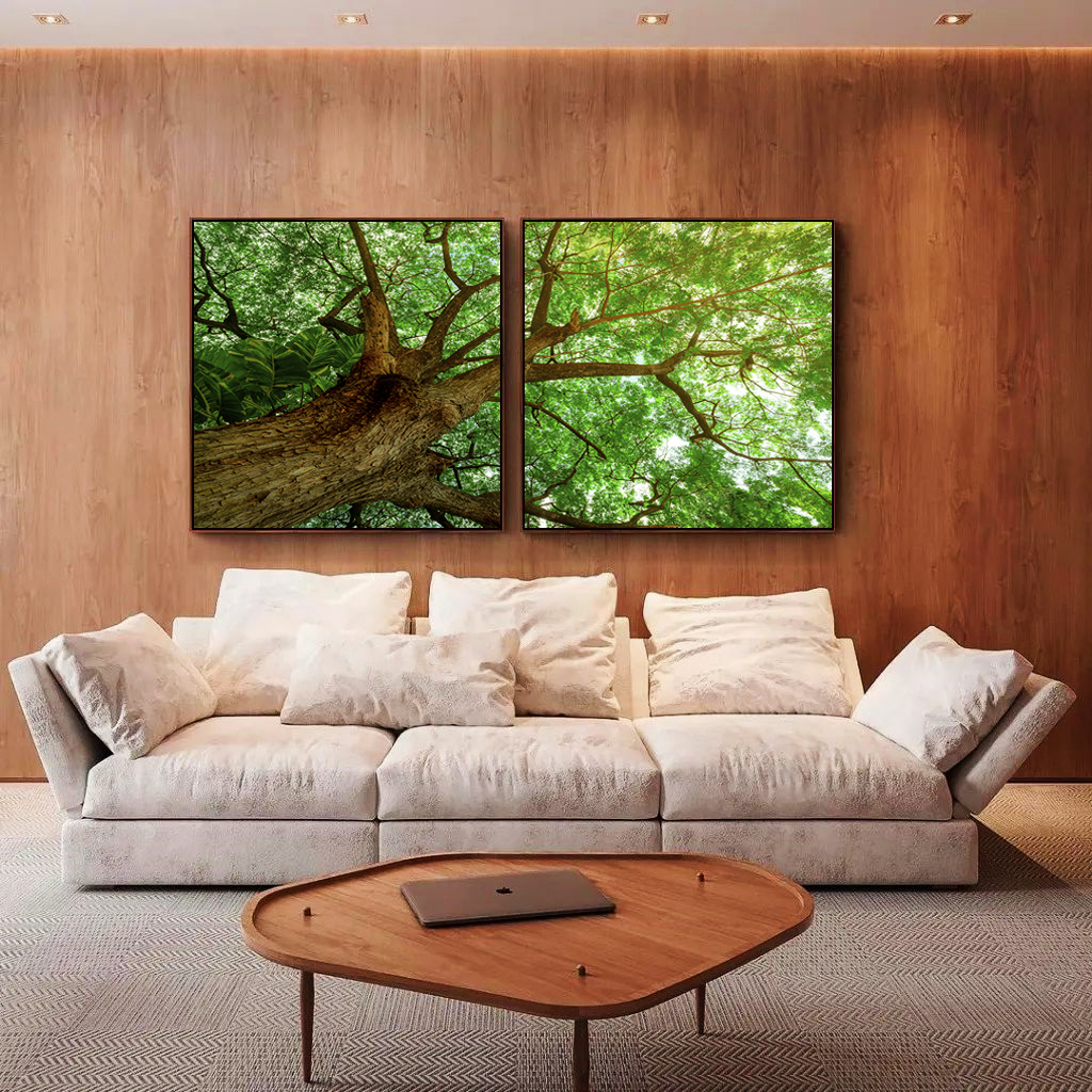 Composição cheia de frescor e sofisticação. Este Duo de Quadros Quadrado de copas de árvore é perfeito para quem busca harmonia em salas, escritórios modernos ou halls de entrada. Moldura flutuante contemporânea com arte em canvas vibrante.