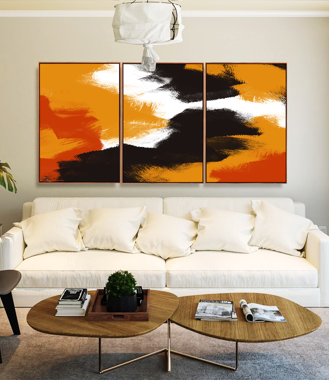 Trio de Quadros abstrato com efeito pintura em laranja, preto e branco, criando contraste, movimento e sofisticação. A escolha ideal para salas, quartos, escritórios ou halls de entrada, elevando a decoração com arte contemporânea.