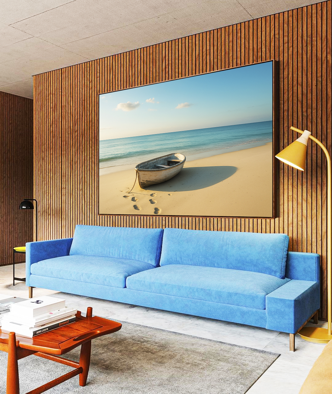 Este Quadro Horizontal traz a serenidade do mar azul e o encanto de um barco sob céu claro. Perfeito para iluminar sua Sala, Escritório ou Quarto com paz, elegância e a energia revigorante da Natureza. Moldura Flutuante Sofisticada.