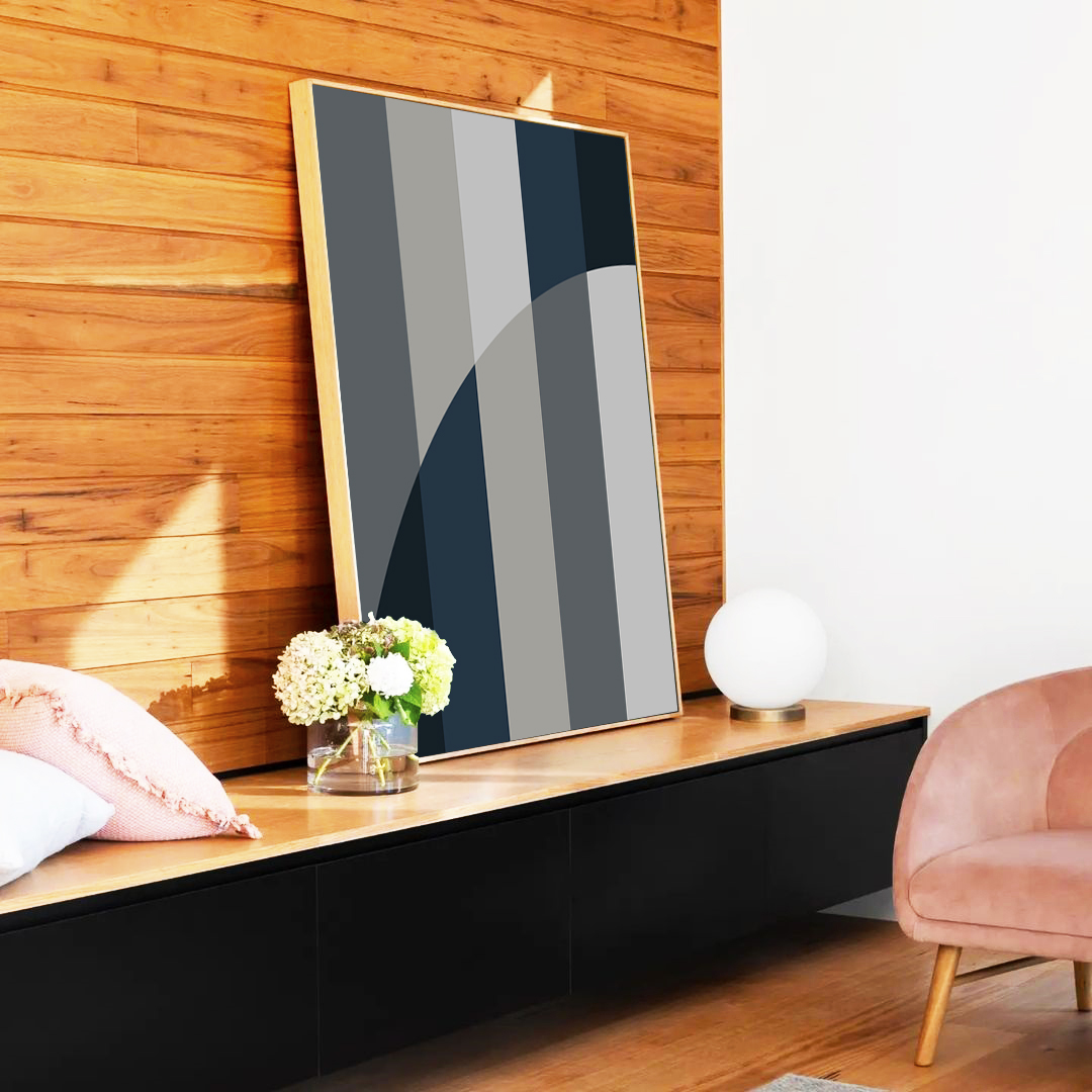 Este Quadro Vertical combina listras e formas geométricas em azul e cinza, trazendo harmonia e estilo à decoração.