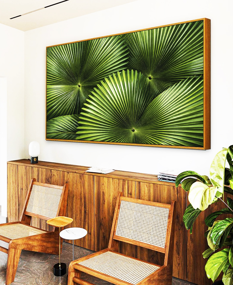 Folhas de palmeira-leque em verde intenso formando desenho radial sofisticado inspirado na natureza tropical. Estilo botânico moderno que adiciona vida, frescor e elegância ao ambiente.