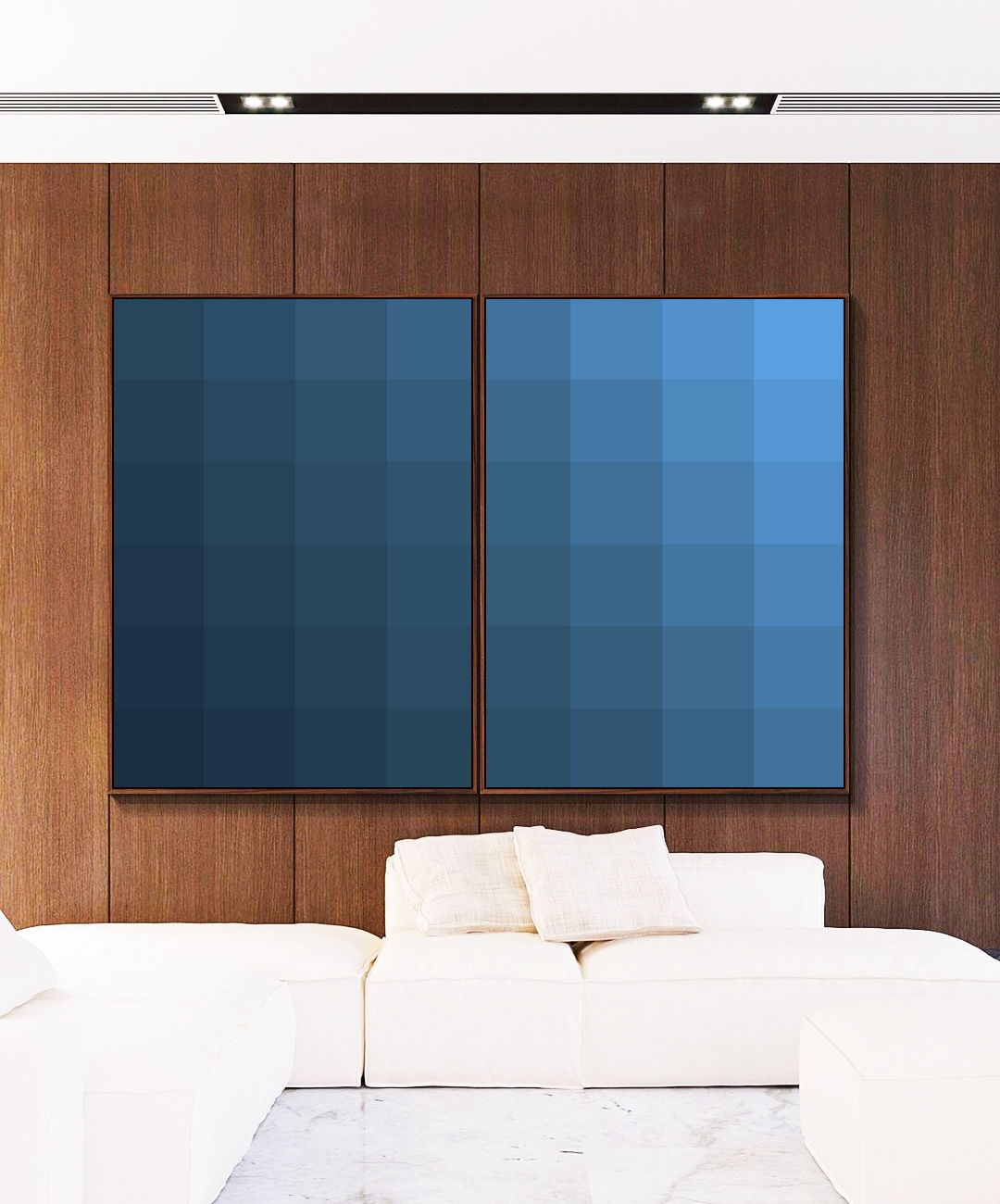 Moderno e sofisticado, este Duo de Quadros geométrico em degradê azul cria profundidade e equilíbrio visual no ambiente. A escolha ideal para salas elegantes, quartos refinados, escritórios contemporâneos ou halls de entrada com estética atual.