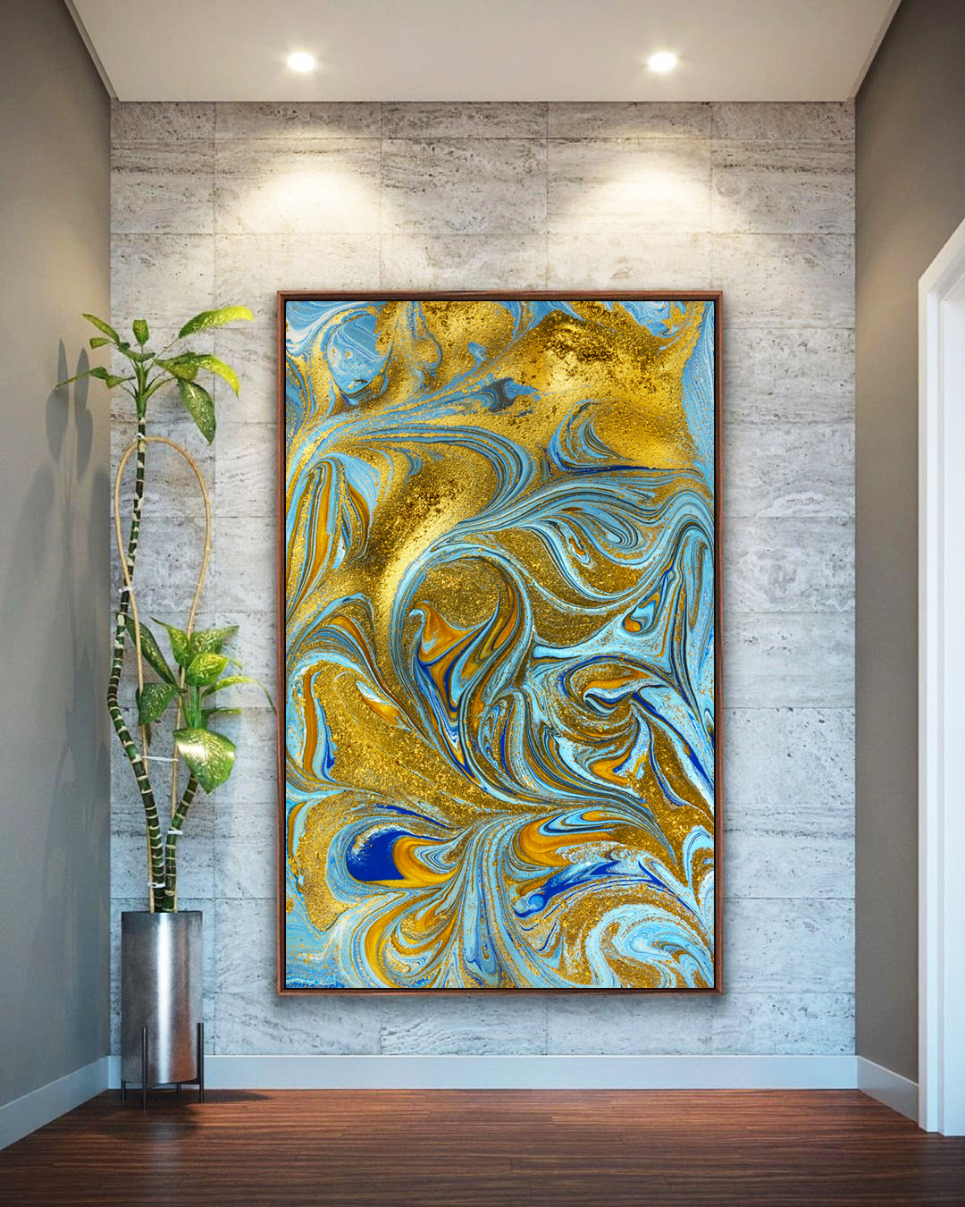Transforme seu ambiente com este Quadro Vertical abstrato em turquesa e dourado, com arte fluida. Perfeito para salas, quartos e escritórios, criando uma atmosfera sofisticada e elegante. Impressão premium sobre canvas, com moldura resistente e de alta qualidade.
