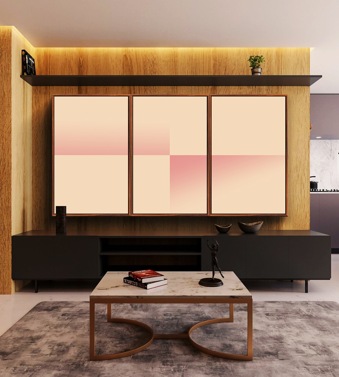Este Trio de Quadros com degradê geométrico em tons de rosa cria uma atmosfera suave e moderna. A escolha ideal para salas, quartos ou halls de entrada que buscam delicadeza, harmonia e um toque contemporâneo de sofisticação.