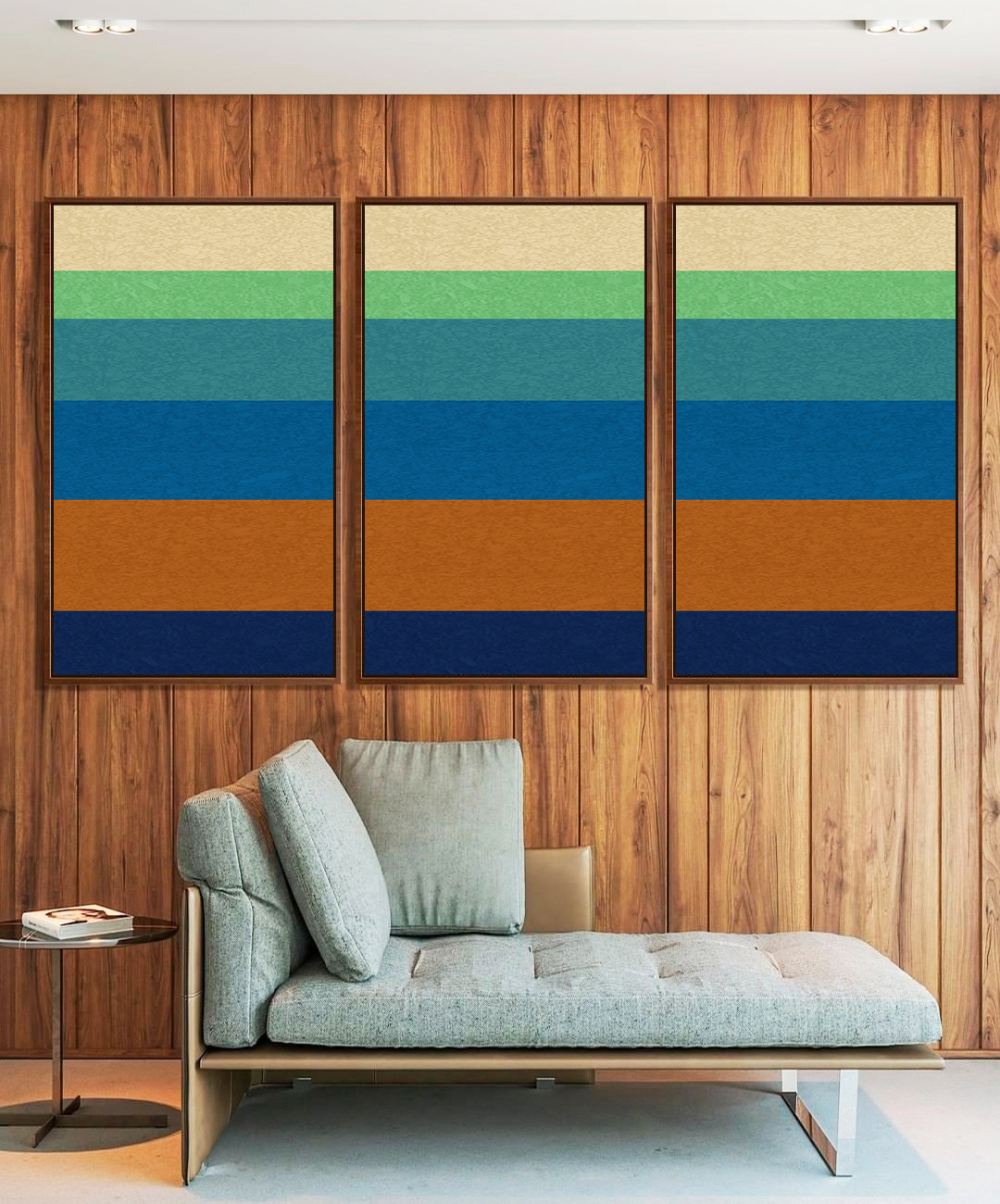 Trio de Quadros abstrato com listras em azul turquesa e laranja, criando movimento e personalidade na decoração. A escolha ideal para salas, quartos, escritórios ou halls de entrada, trazendo modernidade, energia visual e sofisticação.