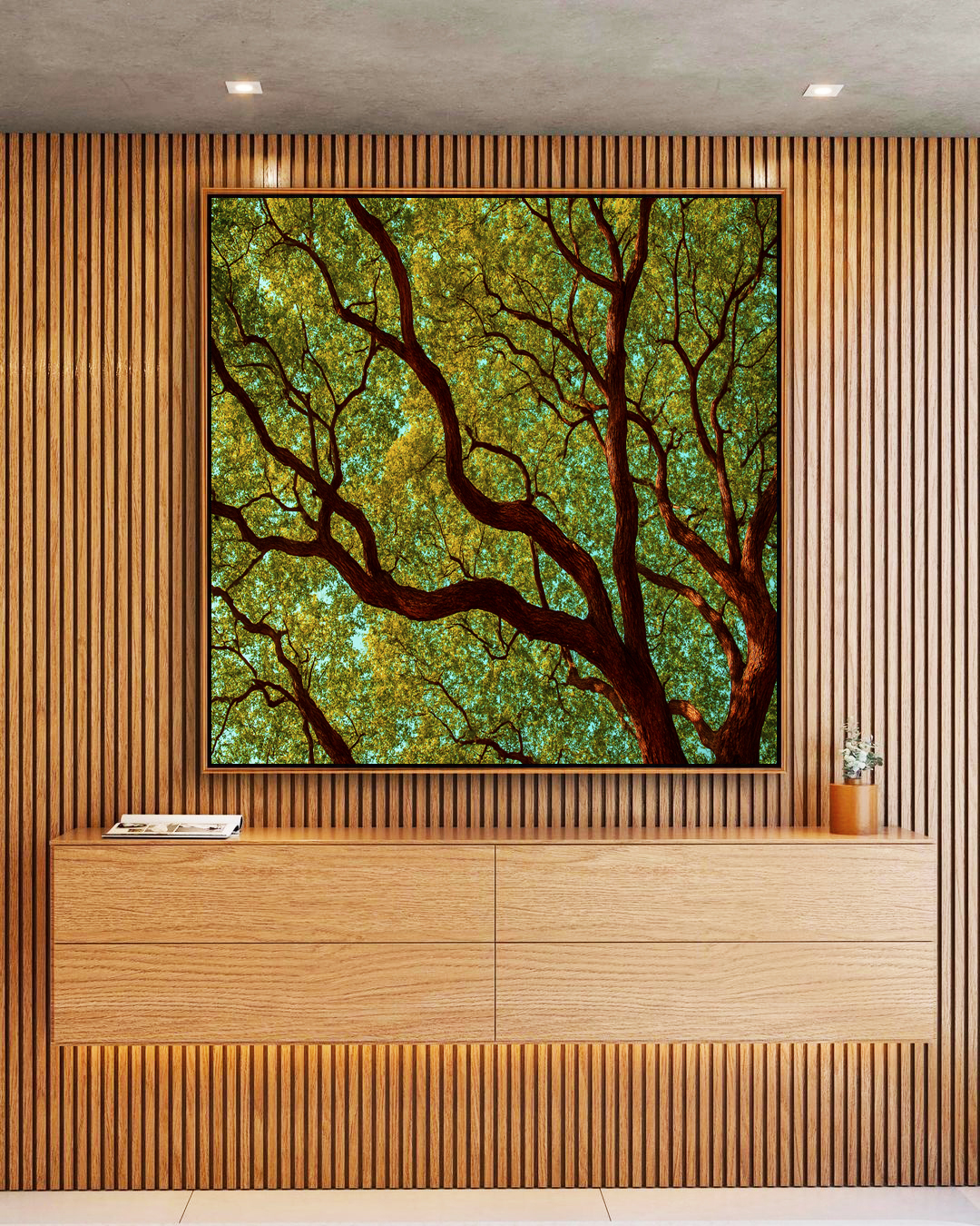 Este Quadro Quadrado celebra a harmonia entre o verde das árvores e o azul do céu, criando uma atmosfera revigorante e sofisticada. Uma escolha perfeita para salas, quartos ou halls de entrada, levando vida e equilíbrio à sua decoração.