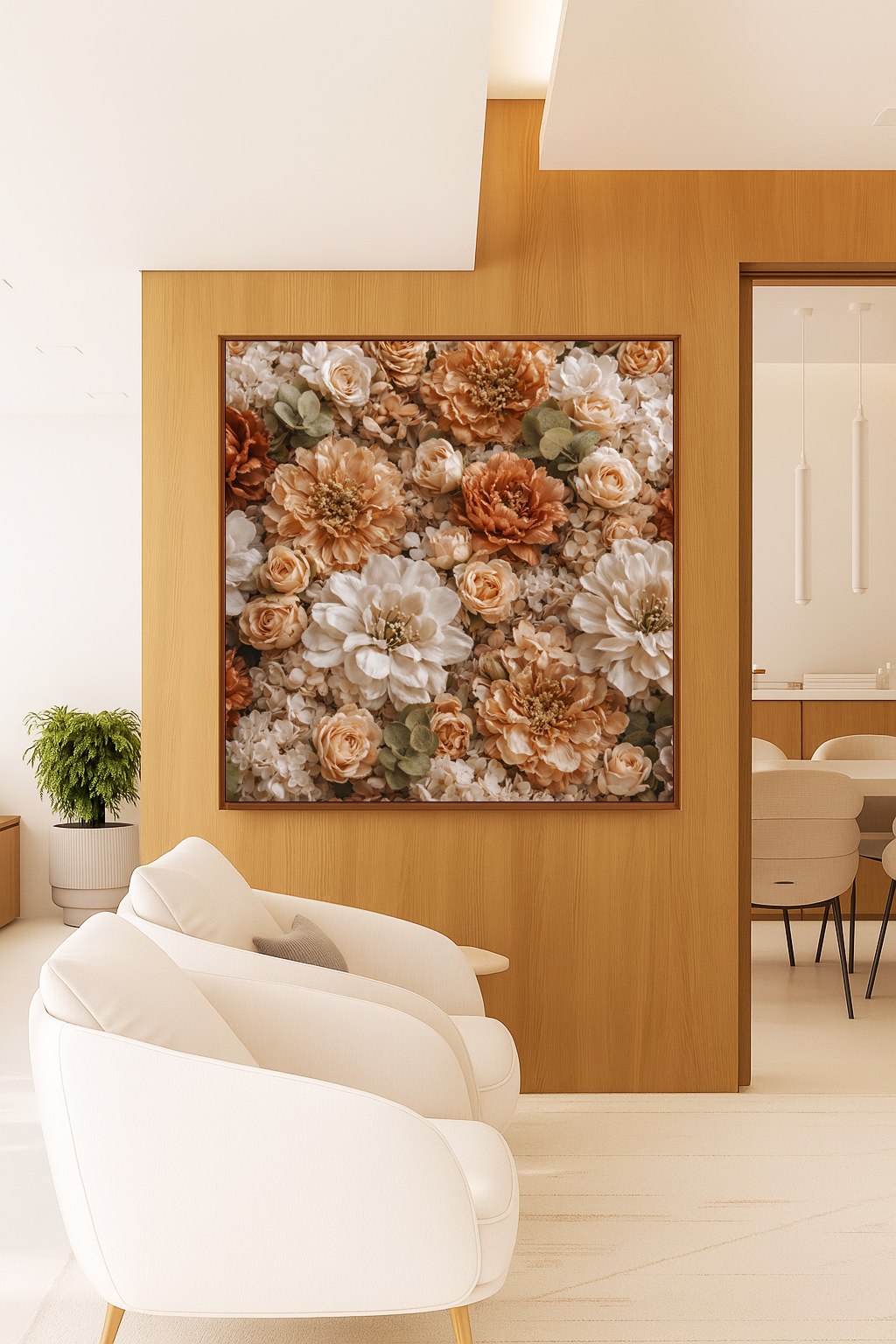 Flores exuberantes como peônias, rosas e dálias criam uma atmosfera romântica e refinada. Perfeita para salas de estar, quartos, halls e espaços que valorizam beleza, leveza e estilo atemporal.