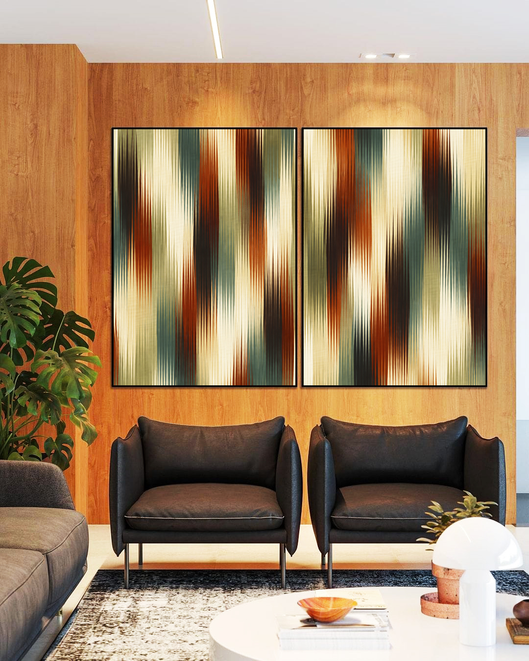 Vibrante e harmonioso, este Duo de Quadros em laranja, verde e bege cria ponto focal elegante e atual na decoração. Ideal para compor salas modernas, quartos estilosos ou halls de entrada imponentes, valorizando o décor com presença premium.