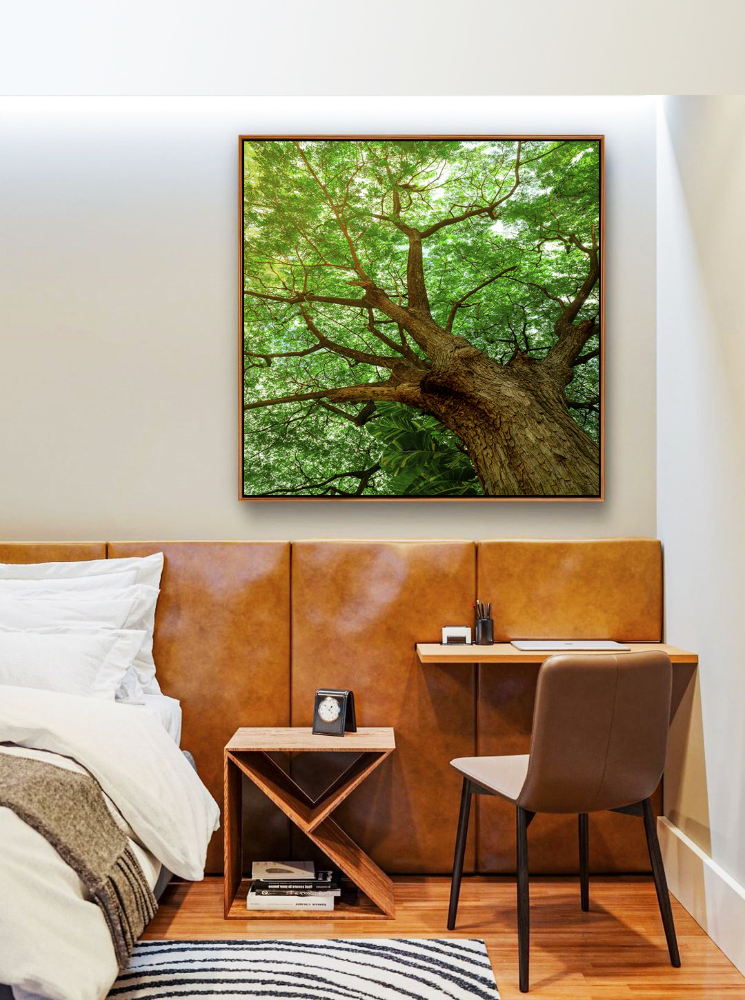 Explore a beleza da natureza com este Quadro Quadrado de copa de árvore em tons verdes vivos. Ideal para salas iluminadas, quartos sofisticados e escritórios criativos. Moldura flutuante moderna em canvas de excelente qualidade. Beleza e Impacto Visual.