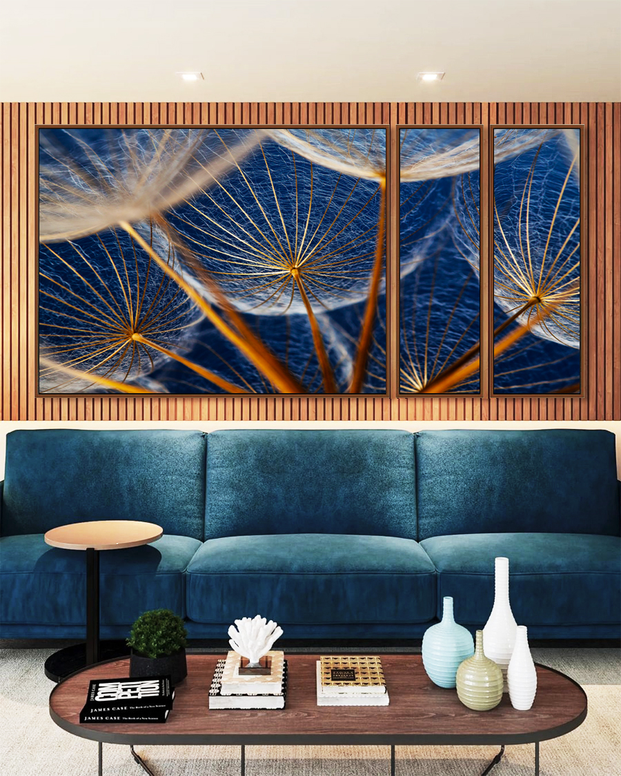 Encante com o Trio de Quadros Estilizados Flor Dente de Leão em tons de cobre e azul. Ideal para sala, quarto ou escritório, traz arte em canvas com moldura moderna e um toque de natureza sofisticada para transformar seu ambiente.