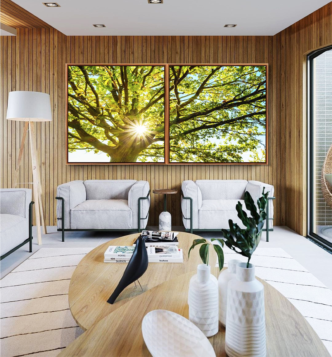 A beleza das folhas verdes iluminadas pelo sol dá a este Duo de Quadros Quadrados uma sensação de calma e renovação.