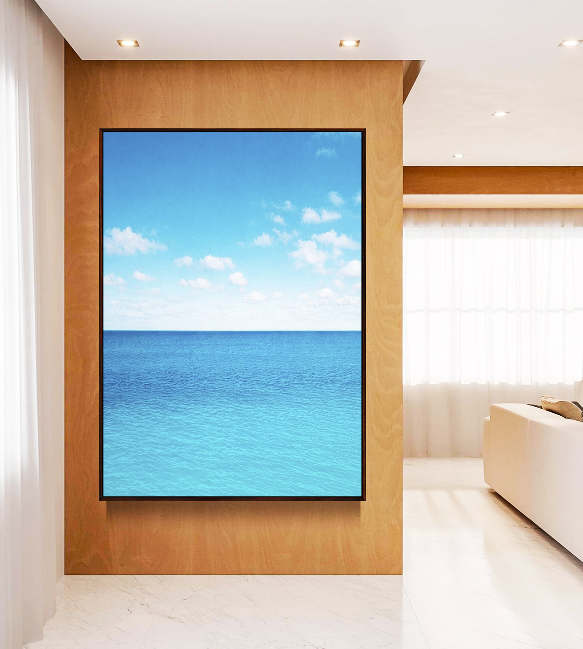 Sereno e sofisticado, este Quadro Vertical com mar calmo azul e céu claro com nuvens transmite frescor e profundidade visual, criando atmosfera de paz. Ideal para decorar salas elegantes, quartos refinados ou escritórios modernos.