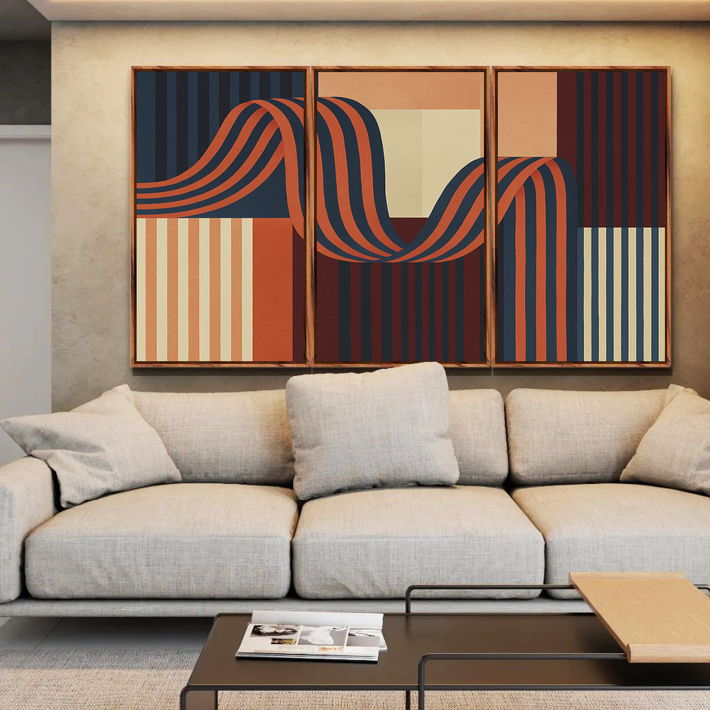 Trio de Quadros Abstrato Geométrico em tons de azul, salmão e bordô, que trazem movimento e sofisticação às paredes. Produzidos em Canvas com Moldura Flutuante, são ideais para sala de estar, hall de entrada ou escritório elegante.
