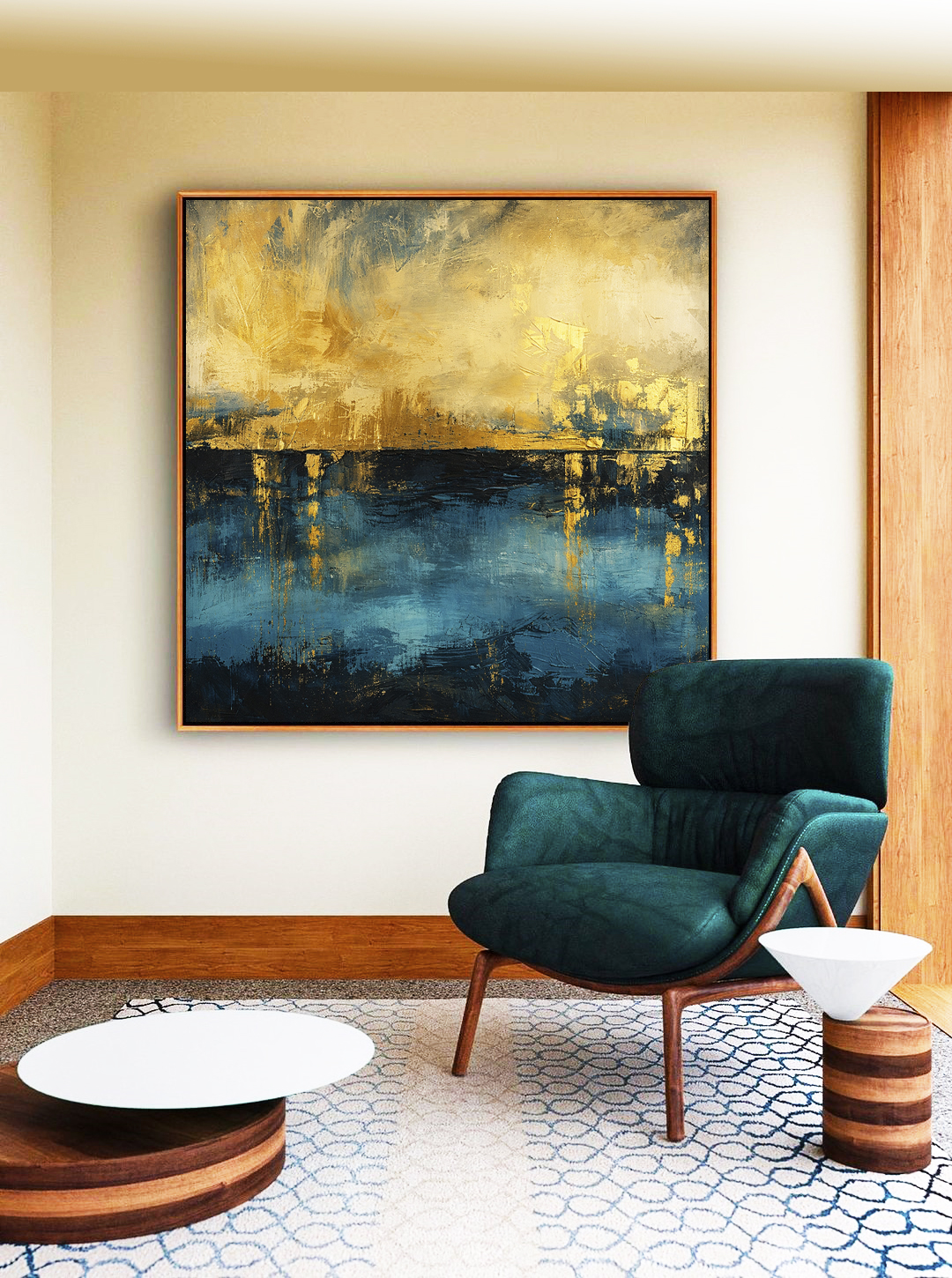 Amarelo ouro luminoso e azul petróleo profundo criam um visual marcante e sofisticado. Arte abstrata com textura elegante para salas de estar, quartos ou escritórios . Decoração moderna, contemporânea e refinada para ambientes elegantes.