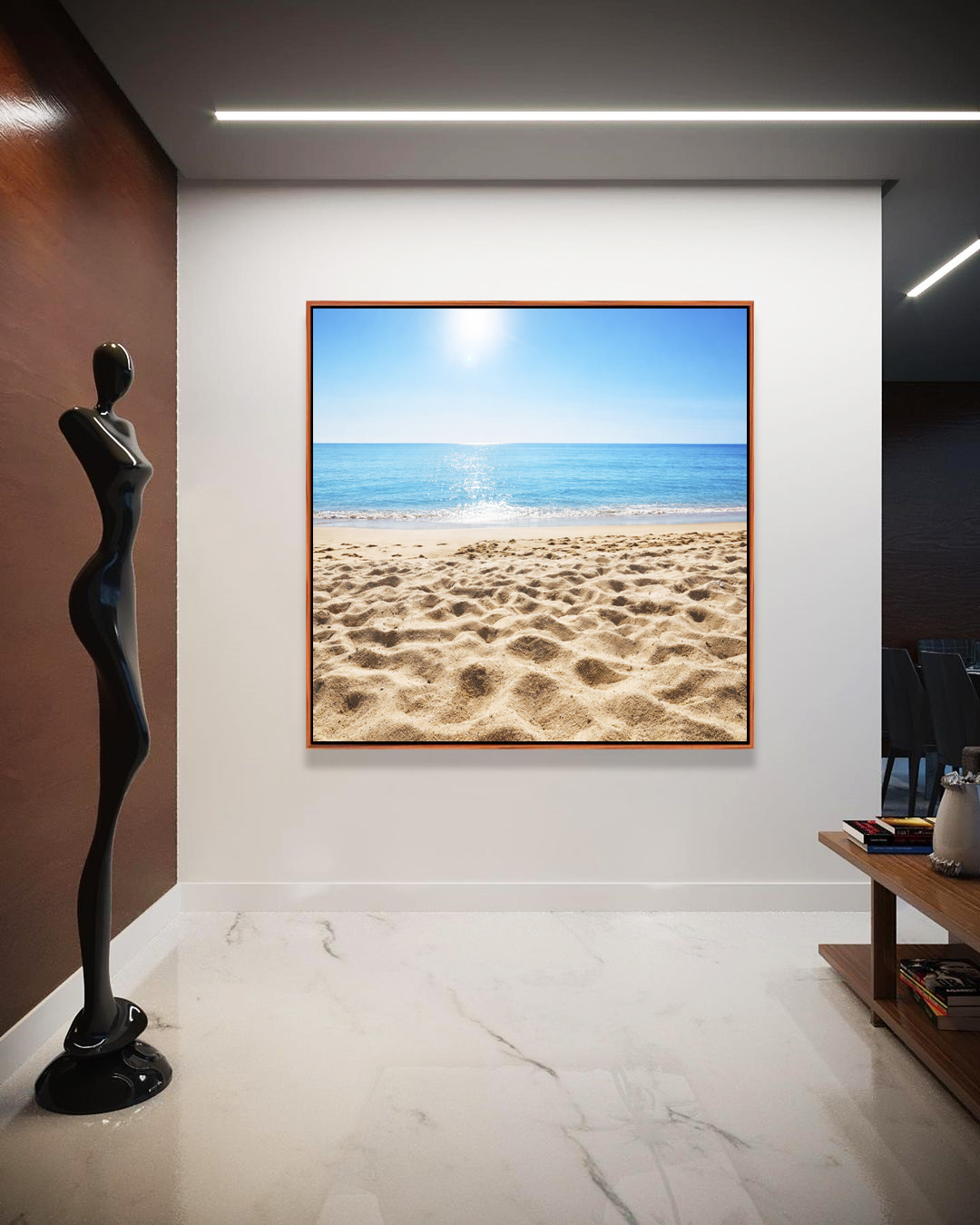 O brilho suave do sol refletindo no mar traz harmonia e aconchego ao espaço. Ótimo para quartos, salas de estar, consultórios ou cantinhos de relaxamento. Belíssimo!
