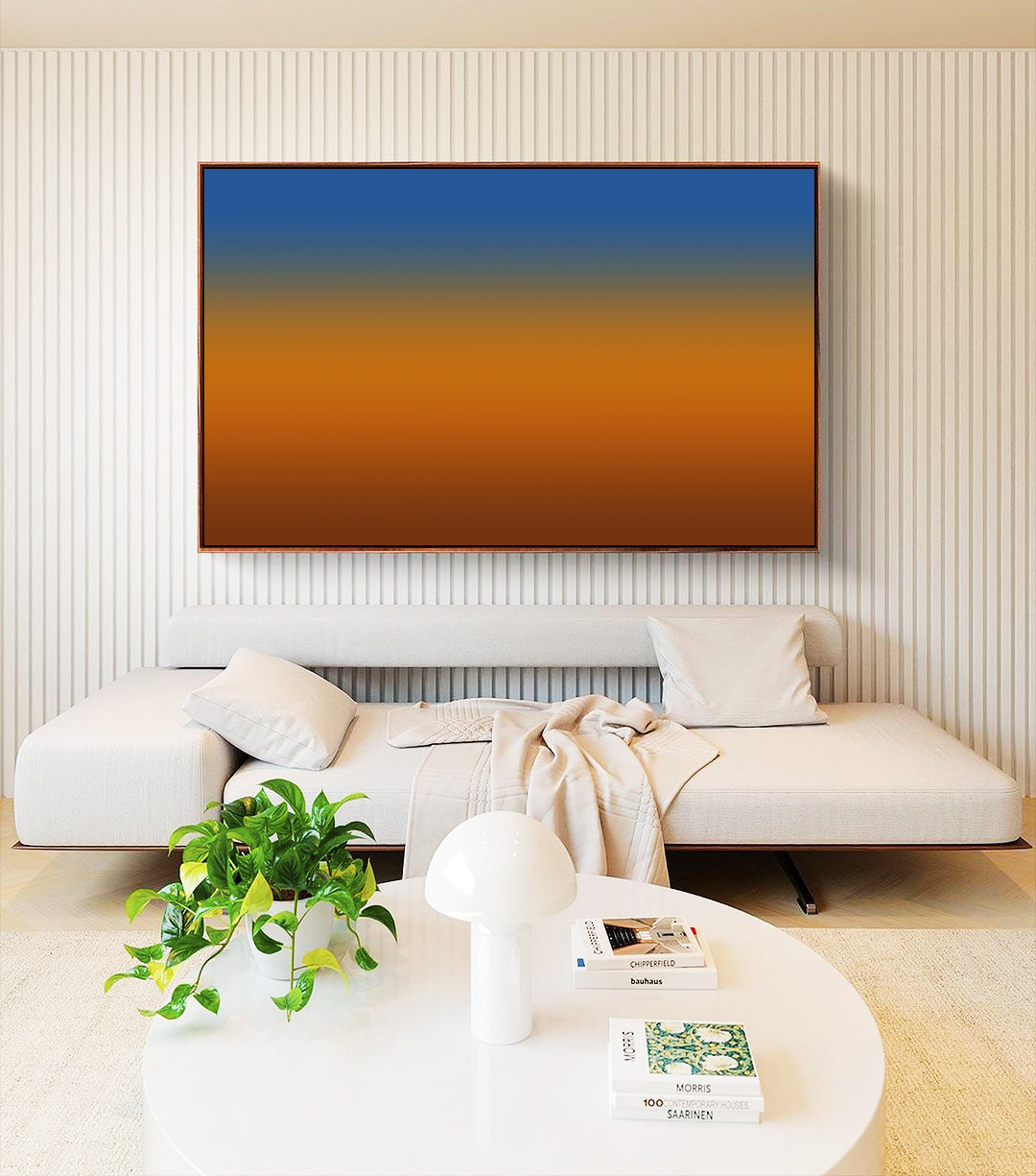 Tons marrom terra, cobre e azul em degradê suave criam um visual contemporâneo cheio de elegância. Ideal para salas, quartos, escritórios ou hall. Perfeito para decoração sofisticada, interiores modernos e ambientes com estilo refinado.