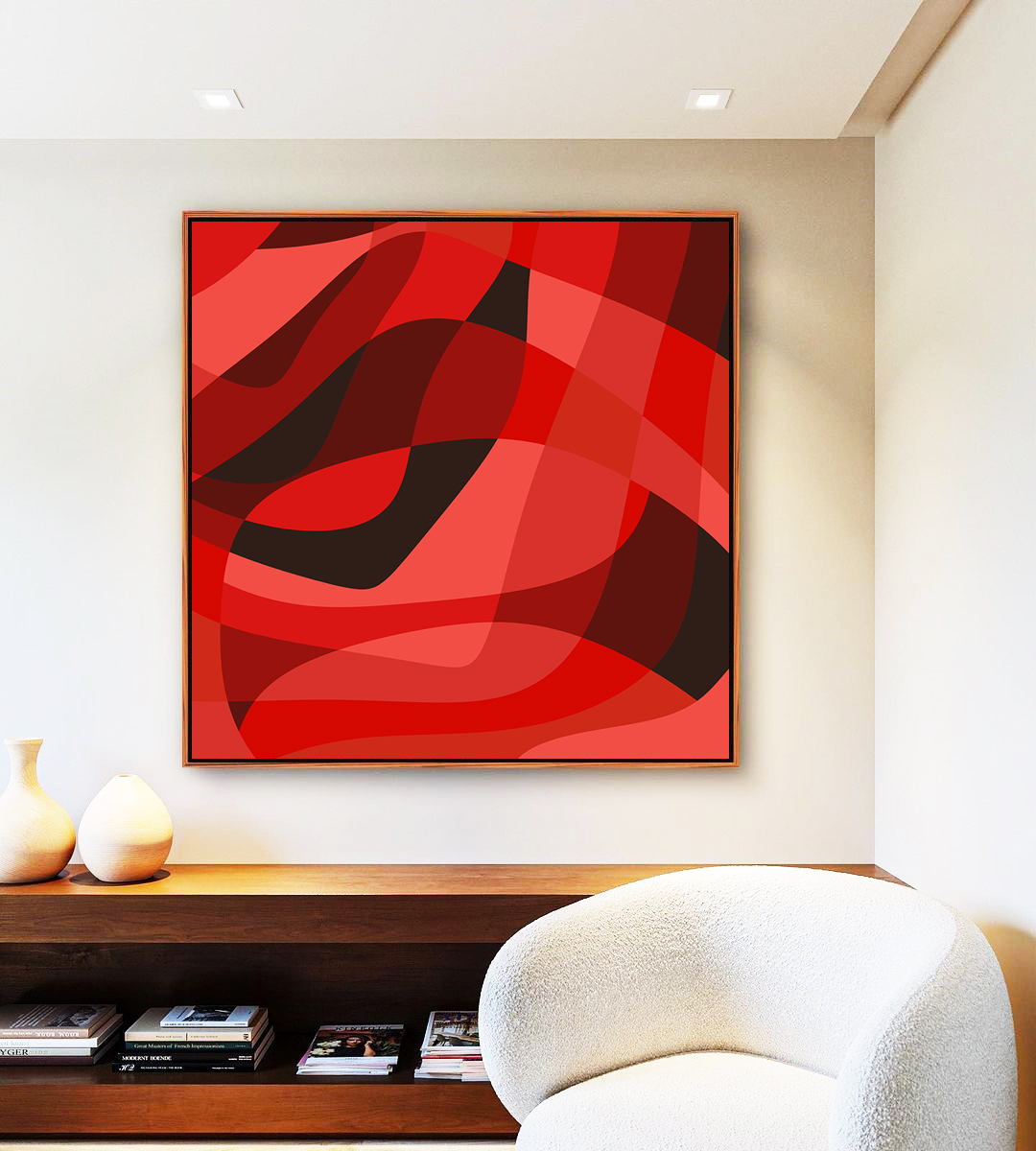 Com uma fusão elegante de vermelho e preto, este Quadro Quadrado oferece intensidade e charme contemporâneo.