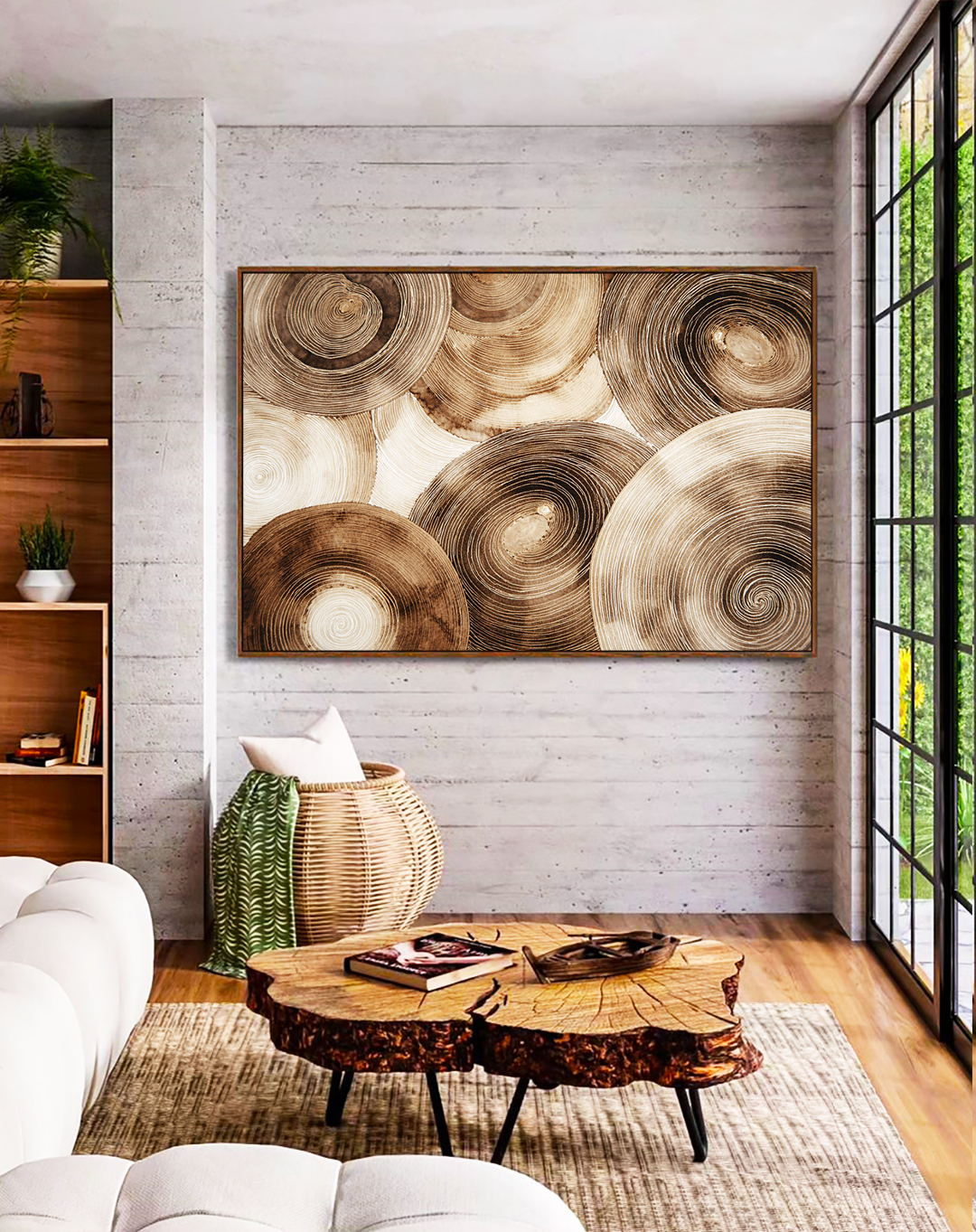 Moderno e envolvente, este Quadro Horizontal com formas circulares em marrom e bege traz profundidade visual e design elegante. A escolha certa para iluminar salas amplas, quartos refinados ou escritórios contemporâneos.