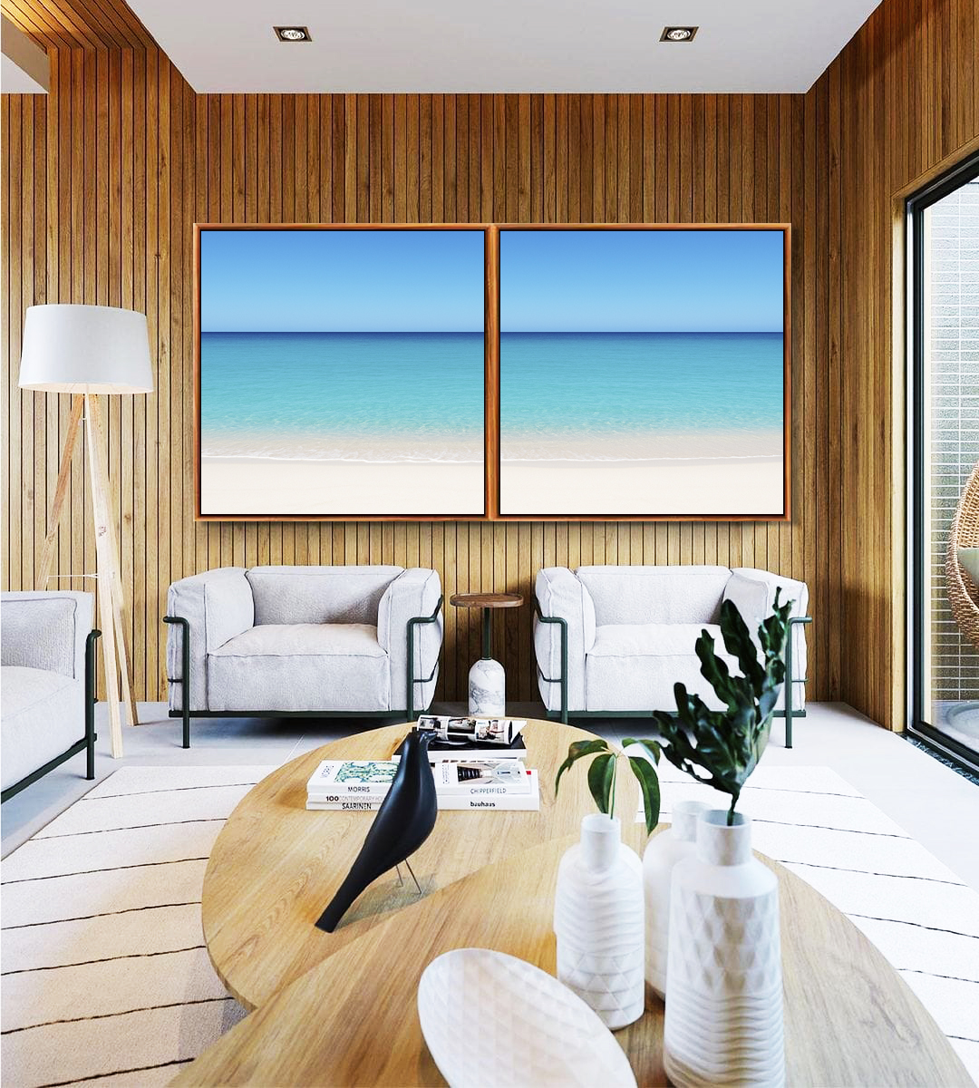 Este Duo de Quadros Quadrados retrata a serenidade do mar azul e o brilho do céu limpo, evocando calma e harmonia.