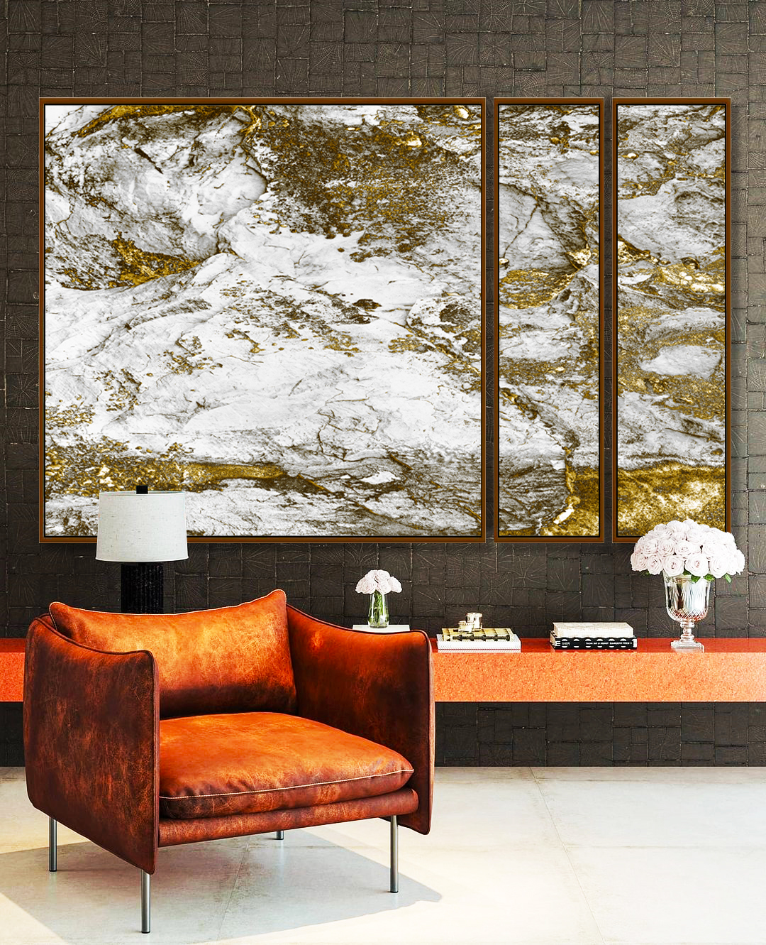 Adicione sofisticação à sua decoração com este Trio de Quadros Estilizados abstratos, efeito mármore nas cores dourado, bronze e cinza. Perfeito para salas e escritórios modernos. Impressão de alta qualidade em canvas, com moldura refinada.