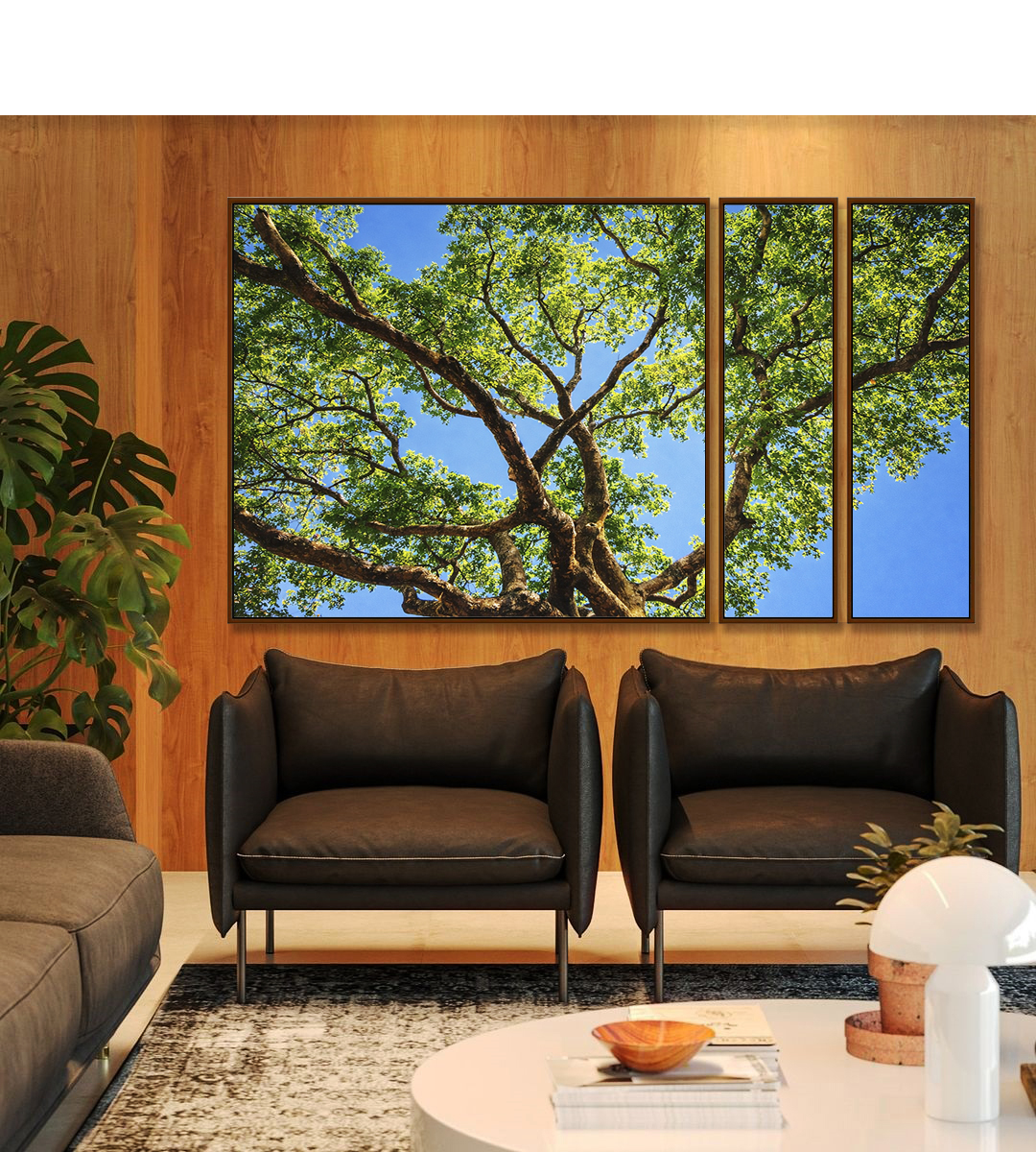 Copa de árvore com folhas verdes e céu azul vivo, criando uma sensação de leveza e conexão com a natureza. Luz natural e frescor que transformam o ambiente. Perfeito para salas e quartos, trazendo calma e equilíbrio.