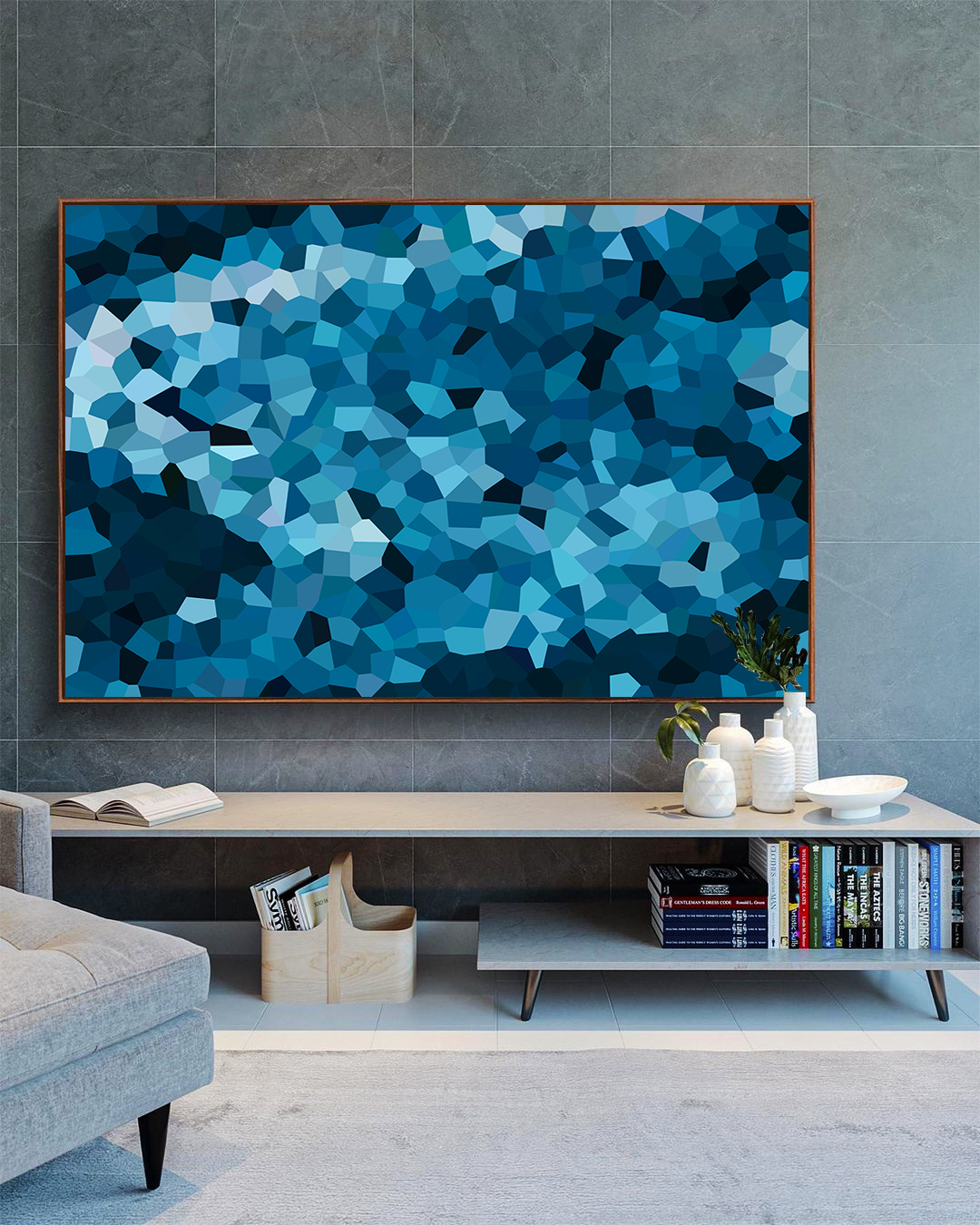 Mosaico abstrato em azul marinho e azul claro, criando movimento e profundidade com estilo moderno. Tons equilibrados trazem leveza e sofisticação. Perfeito para salas e escritórios, valorizando ambientes contemporâneos e elegantes.