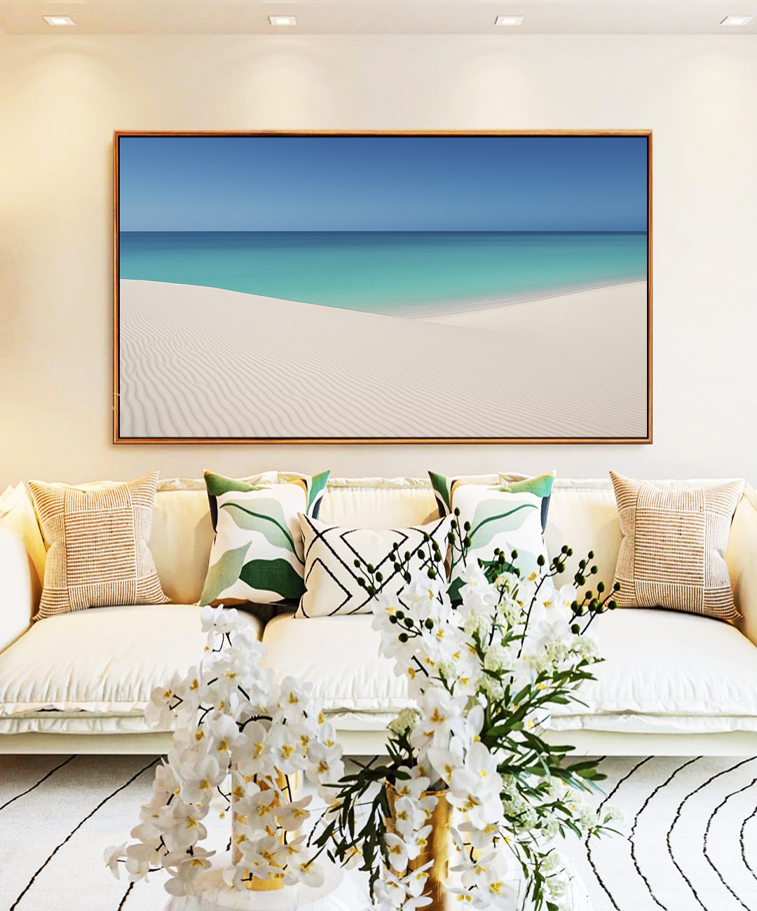 Sereno e sofisticado, este Quadro Horizontal retrata a harmonia entre céu azul, mar tranquilo, praia clara e dunas suaves. Ideal para valorizar salas refinadas, quartos elegantes, escritórios contemporâneos ou halls de entrada bem iluminados.