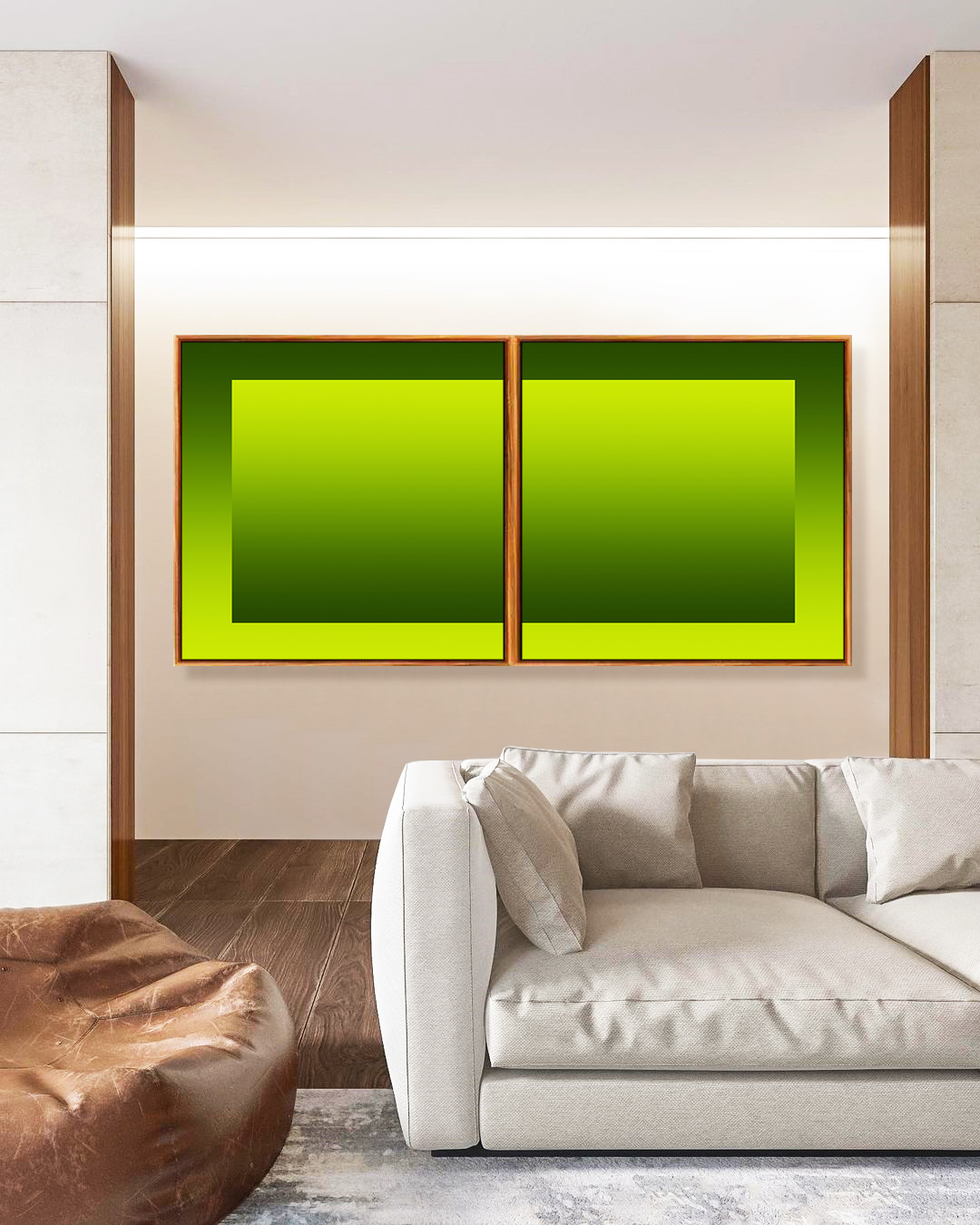 Tons de verde em degradê harmonizam com a moldura moderna, criando um Duo de Quadros Quadrados que inspira leveza e elegância. A escolha certa para transformar salas amplas, quartos ou escritórios em ambientes de puro equilíbrio visual e contemporaneidade.