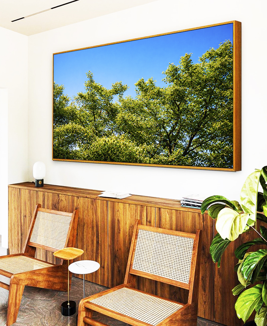 Paisagem de árvores com folhas verdes e céu claro limpo transmite serenidade, natureza e leveza. Estética natural muito usada na decoração contemporânea, criando ambiente acolhedor e equilibrado. Excelente escolha para salas e quartos.
